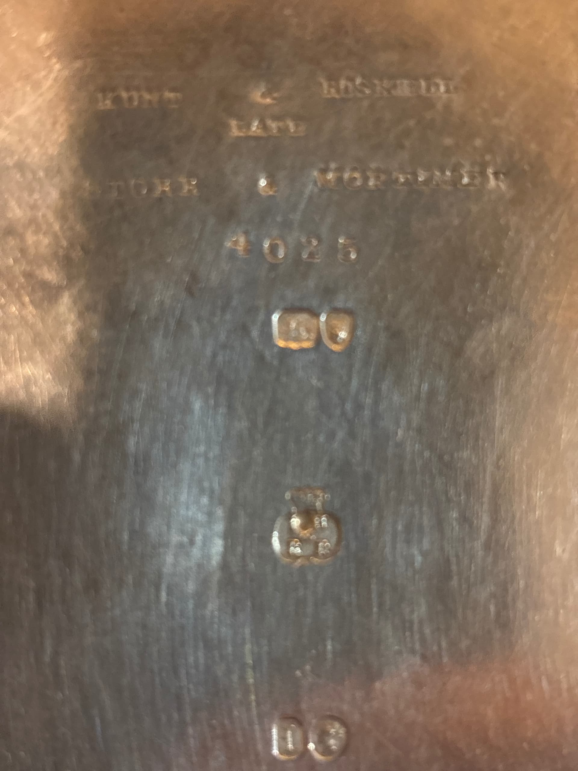 Hunt and Roskell late Storr and Mortimer 4025 a stamp with a running lion a leopard a crown with IH and RR what looks like a Roman L and a Roman head.