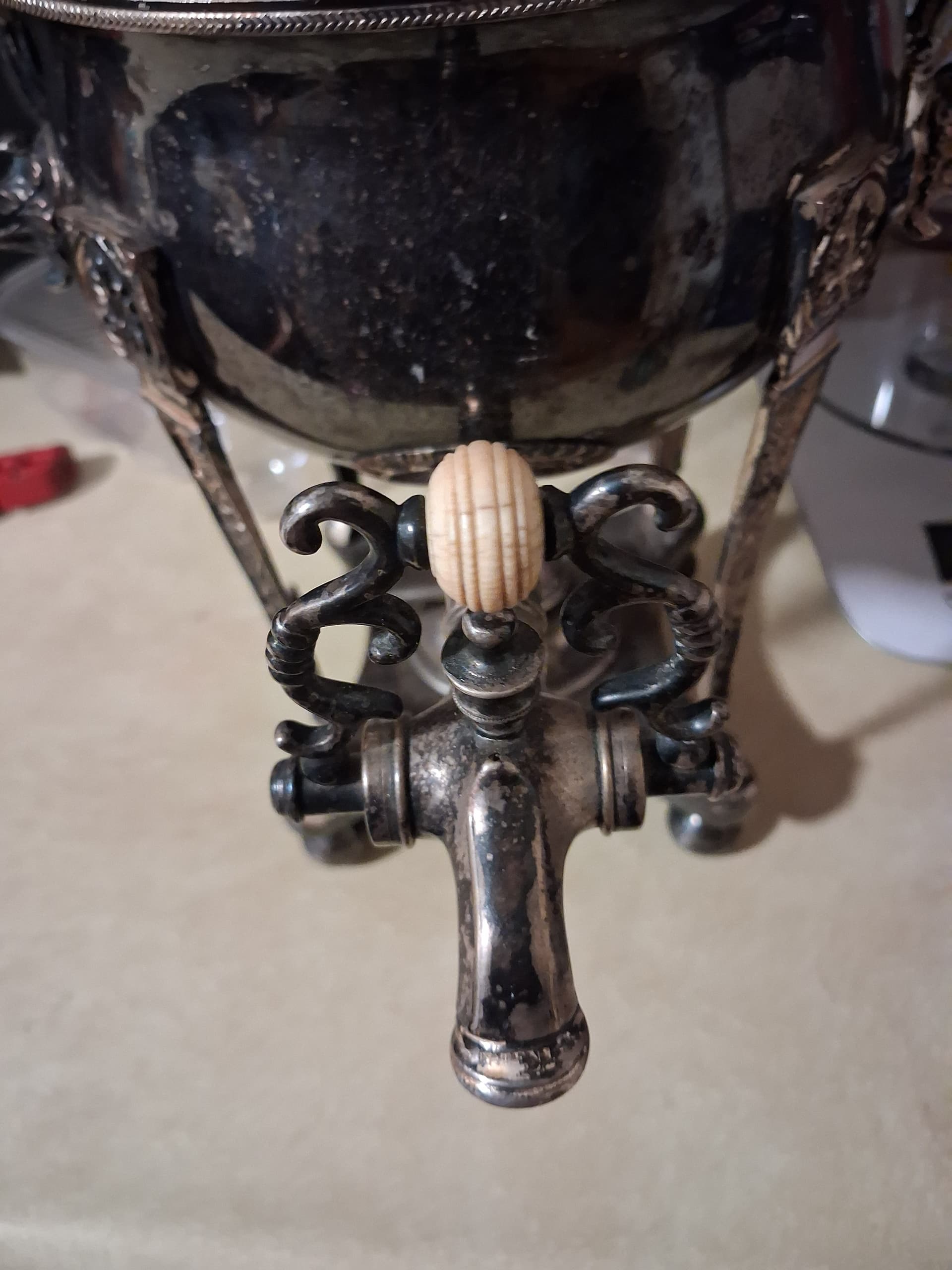 I have an antique tea urn that I cannot t make s red nse of. On the burner t part ( picture 1) it is clearly stamped tb&s then a crown and a lion passant next tk eachother. Which h gets me its Thomas Bradford and sons and it’s shdffield sterling silver. Atleast that much I believe i have right. The only other marks on this thing is an A.M on the inside lip of lid and also on the bottom welded area of spigot. Oh and I t says patent right at top of spigot. The thing looks more like plate but im not sure exactly as im unfamiliar. Could it be possible that just the burner is sterling and the rest is something h else ? Any idea what this thing is worth ? Thanks in advance