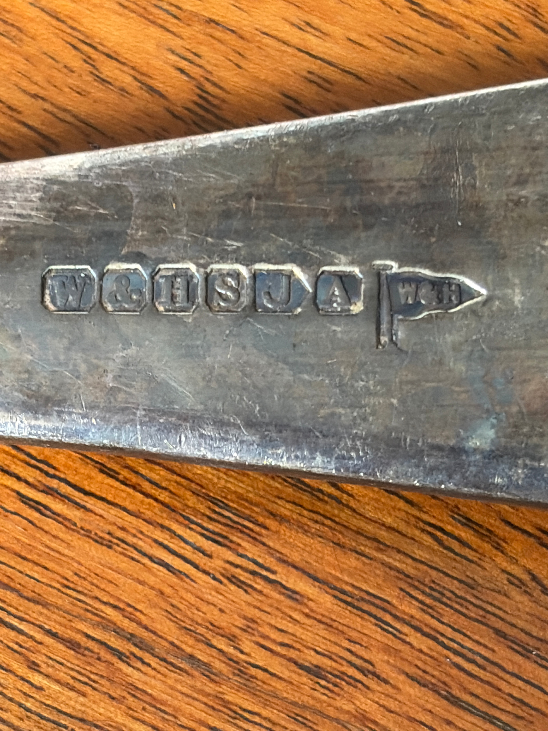 Walker & Hall, Sheffield,1845, George Walker who secured the royalty of electroplating for Sheffield. The business was joined by Henry Hall and became in 1853 Walker & Hall at Howard St with showrooms at 45 Holborn Viaduct, London followed by Liverpool, Manchester, Leeds, Glasgow, Edinburgh, Newcastle, Cardiff, Belfast, Hull, Bristol Then abroad to Melbourne, Sydney and Adelaide, Cape Town, Wellington, Auckland, Christchurch and Dunedin in New Zealand. The business was converted into a limited liability company in 1920 under the style Walker & Hall Ltd. “S” is for Sheffield." A" is the quality of plate and “J” is a batch code probably 1938.