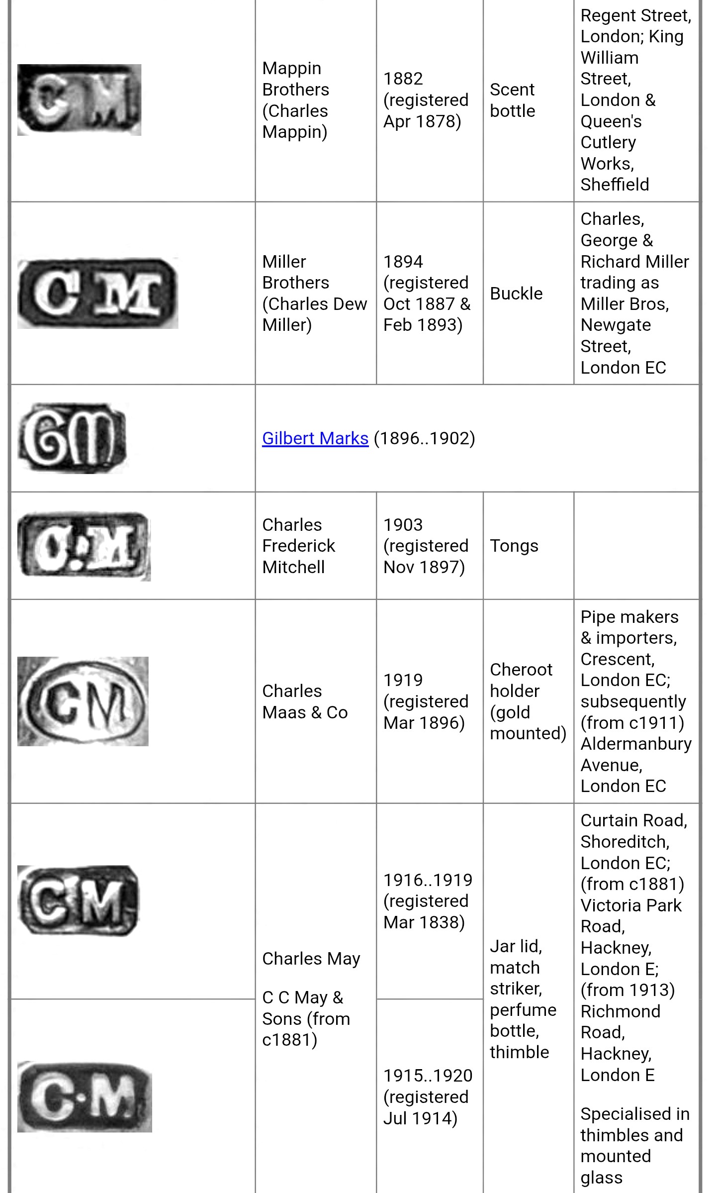 My pondering was due to this recent purchase, where despite extensive research I can’t find corresponding international makers marks for C.M… but 2 likely candidates from England! Charles May and Charles Mappin not only have very similar stamps, but also produced scent bottles around the correct time period.