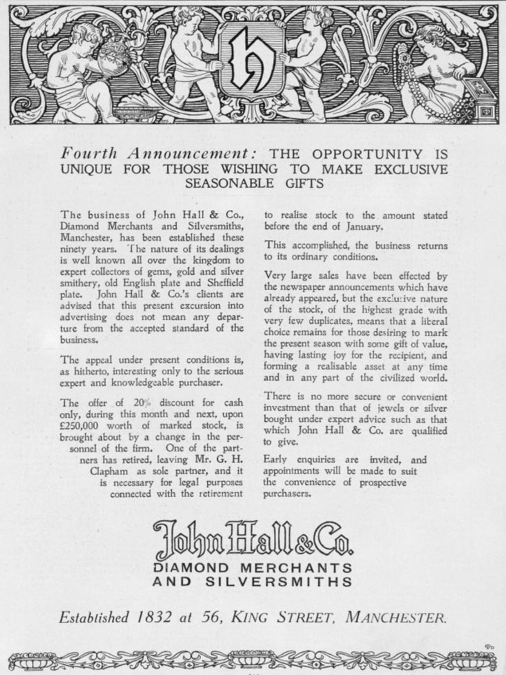 Origin of the business in 1830 as Hatfield & Hall, 68 King Street, Manchester. In 1860 the firm was restyled as John Hall & Co. by partners John Hall Sr, John Clapham, Willian Henry Hall and John Hall Jr.