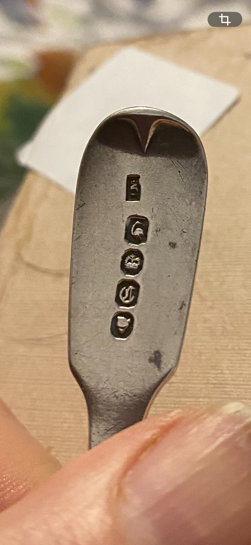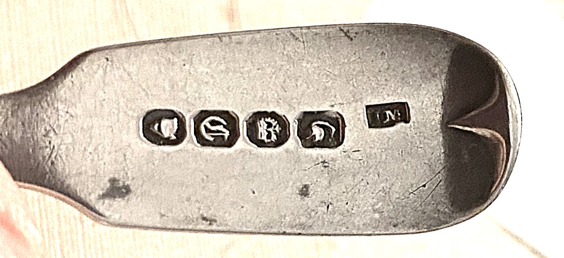 The combination of individual marks shows that this cannot be English (or British) silver. What may be intended to look like an uncrowned leopard’s head (a London mark) would never appear with a crown (a Sheffield mark). I suspect either American coin silver or electroplate. Please clean out the marks so that we can see them properly and then re-post a clear picture.