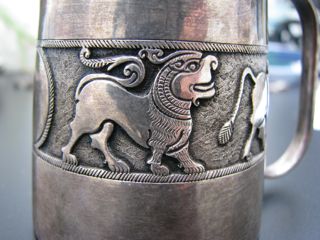 I was given what I think is a christening cup by my grandparents when I was a baby. They were quite affluent and collected many antiques. I am not sure where this cup is from- the hallmark has a vague semblance of a lion, but seems rather distorted if it is and the actual animals on the cup seem more Asian or Middle-Eastern. I am curious as to where it is from, when it was made and how much it might be worth.