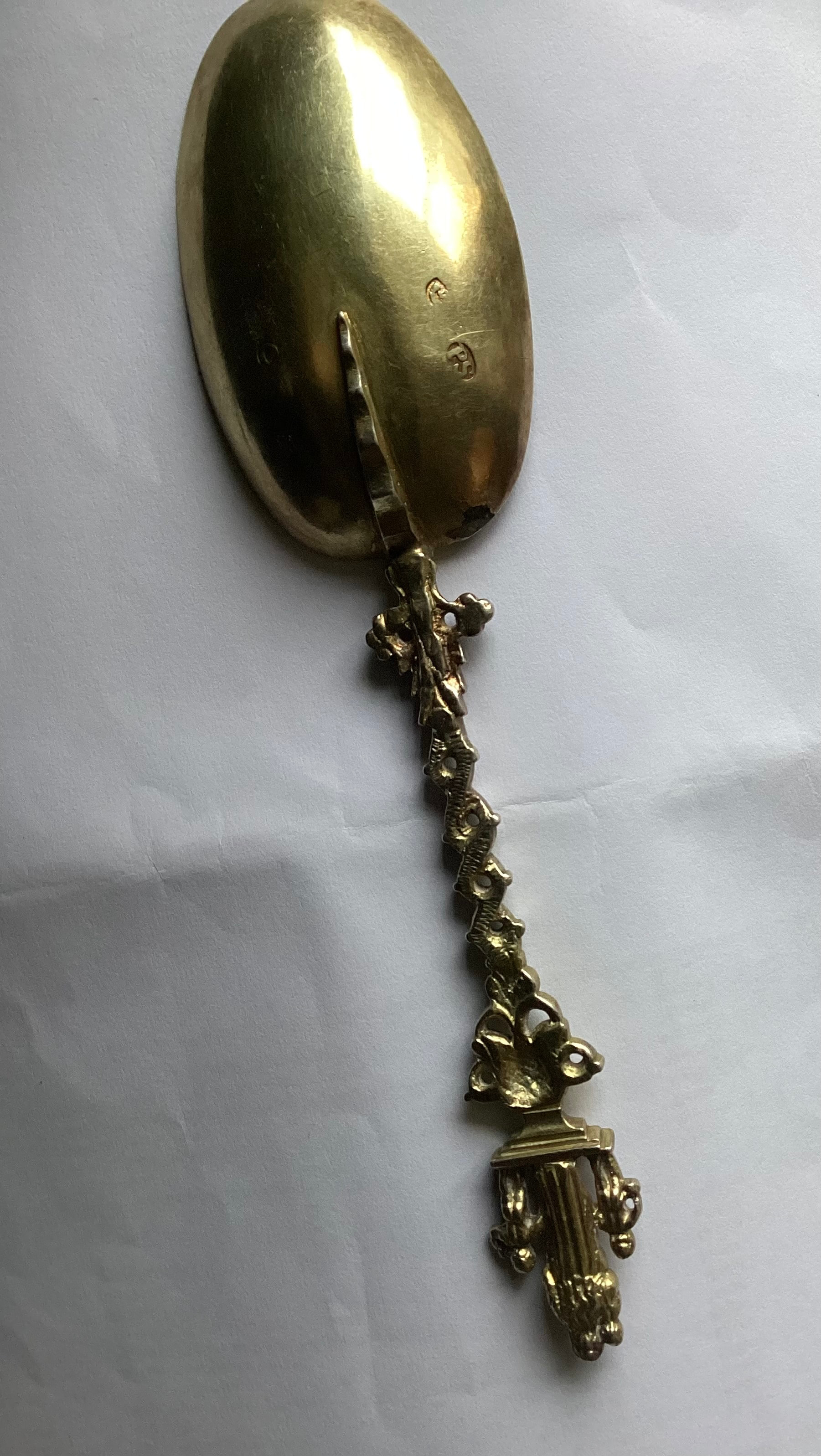 I have had this spoon in my collection for some time. I have been unable to determine the origin. I believe that it might be Dutch but remain uncertain. Paul