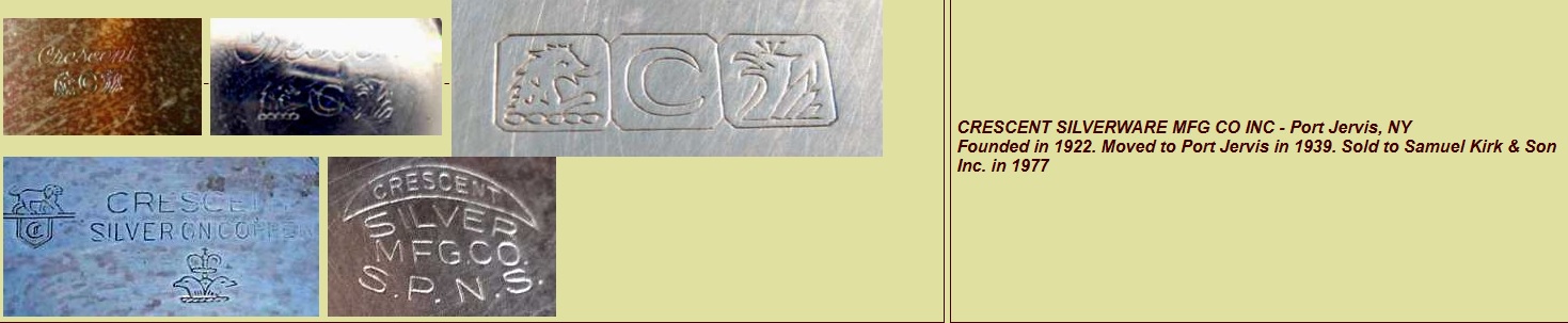 Crescent Silverware Mfg. Co., Inc., was founded in New York City in 1922 and moved to Port Jervis, New York, in 1939. The company specialized in silver-plated hollow ware, chrome-plated items, and pewter. The company ceased operations after it was bought by Samuel Kirk & Son, in 1977 but its products remain popular in the vintage market.