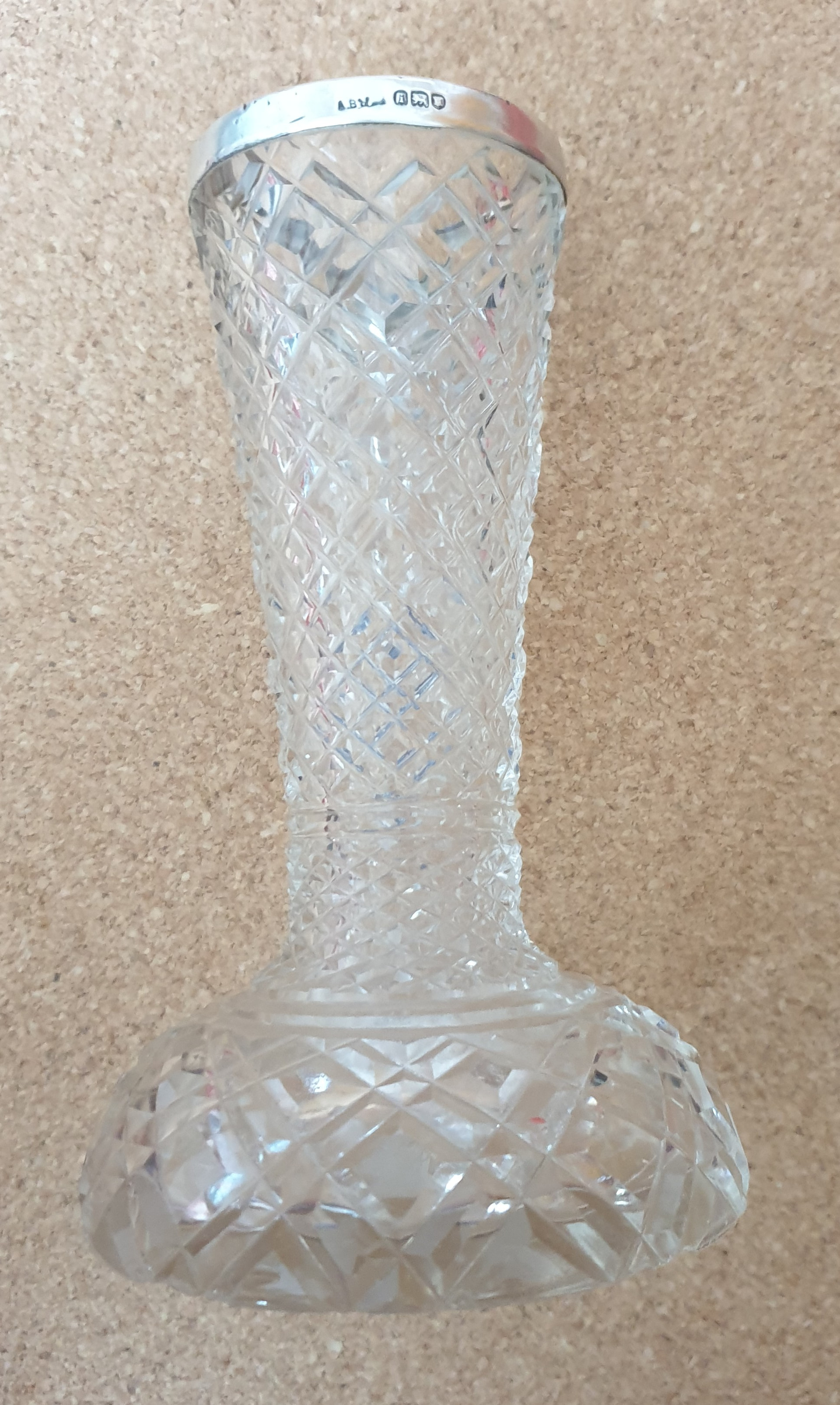 After several hours of searching, I gave up, hoping for your help. I’m trying to decipher the markings on a small (13 cm high) crystal vase topped by a silver ring. It’s definitely London and 1904, but the markings seem to have been re-stamped. The maker’s initials are also enigmatic. Any ideas?