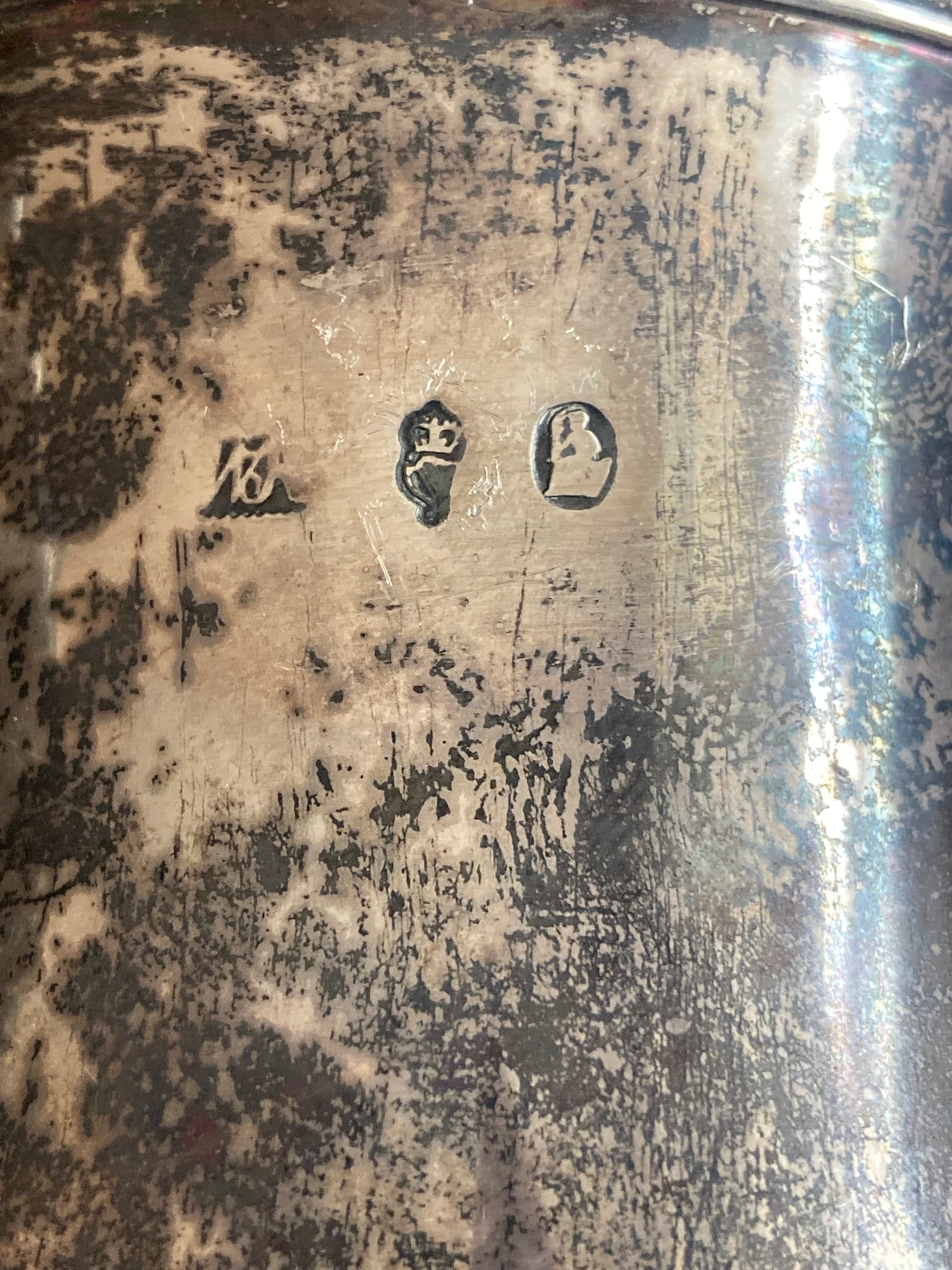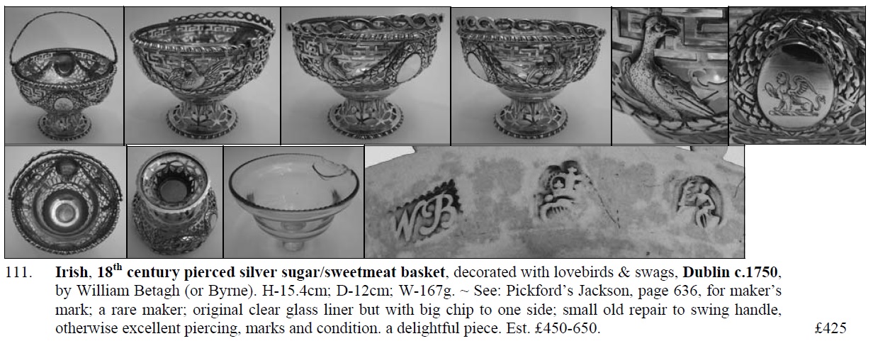 This may well be a very rare Irish 18th century mark last seen on a pierced silver sugar/sweetmeat basket, decorated with lovebirds & swags made in Dublin in about 1750, by William Betagh, or Byrne.