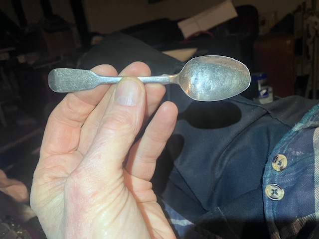 I would be grateful for some help identifying the year and maker on this priceless teaspoon owned by Scottish ancestors hailing from Stonehaven.