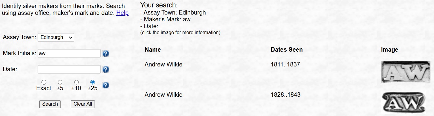 The only other maker I can find is Andrew Wilkie, who was registered in Edinburgh at the right time, but I have so far been unavailable to find his mark.