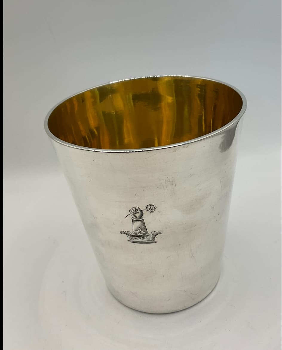 This beaker will have been part of a set of perhaps 12 all fitting inside each other and designed to be picnic ware or for lunches at shooting parties. The drink: a Pimms or a rum concoction. THe myth is cocktails were invented in the roaring 20’s. They were much earlier.