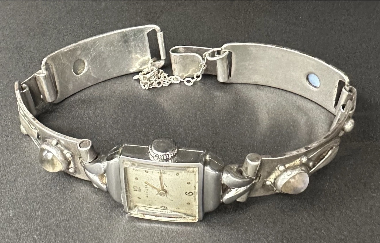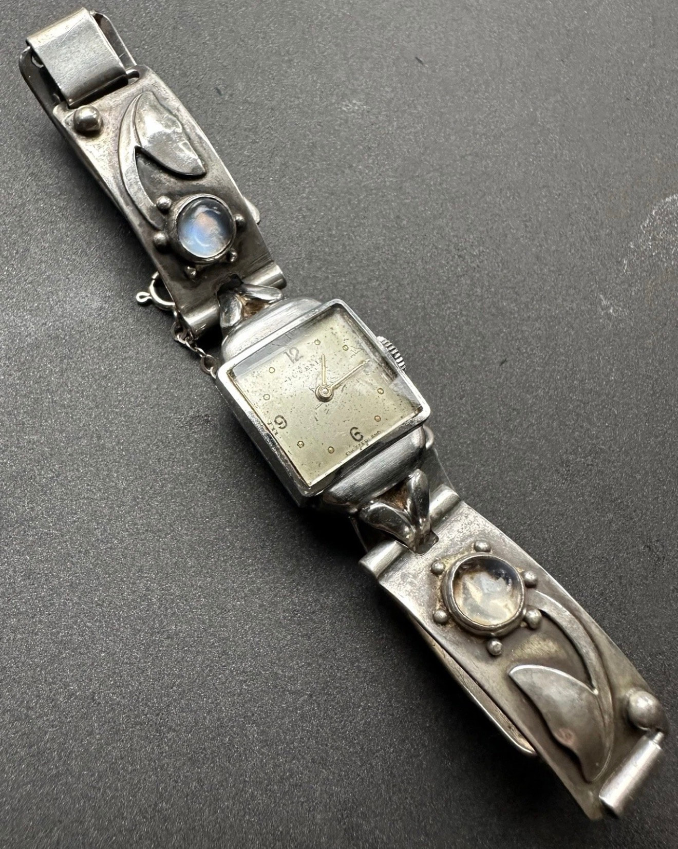 I recently picked up a Georg Jensen “Juvenia” Silver Bracelet Watch with moonstone inlaid. Bracelet is marked 826 USA Georg Jensen Inc. Handwrought.