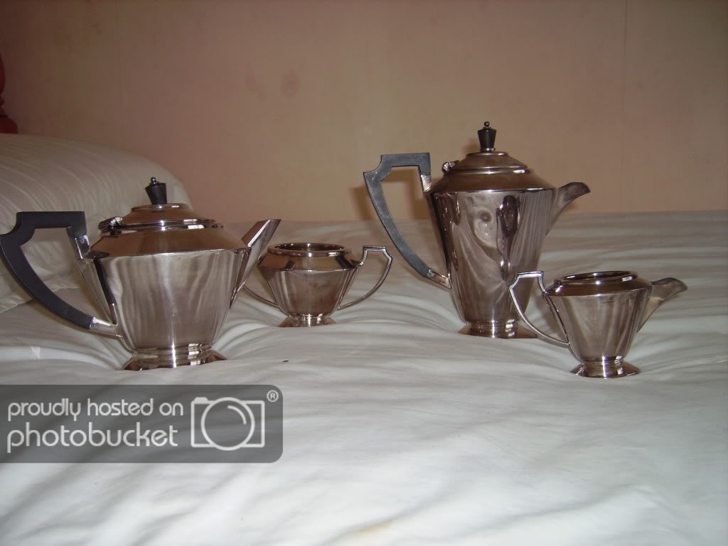 4 piece silver plate tea services seem to be selling on the well-known auction site at £30-£50. Incidentally the tall piece is a hot water jug, not a coffee jug.