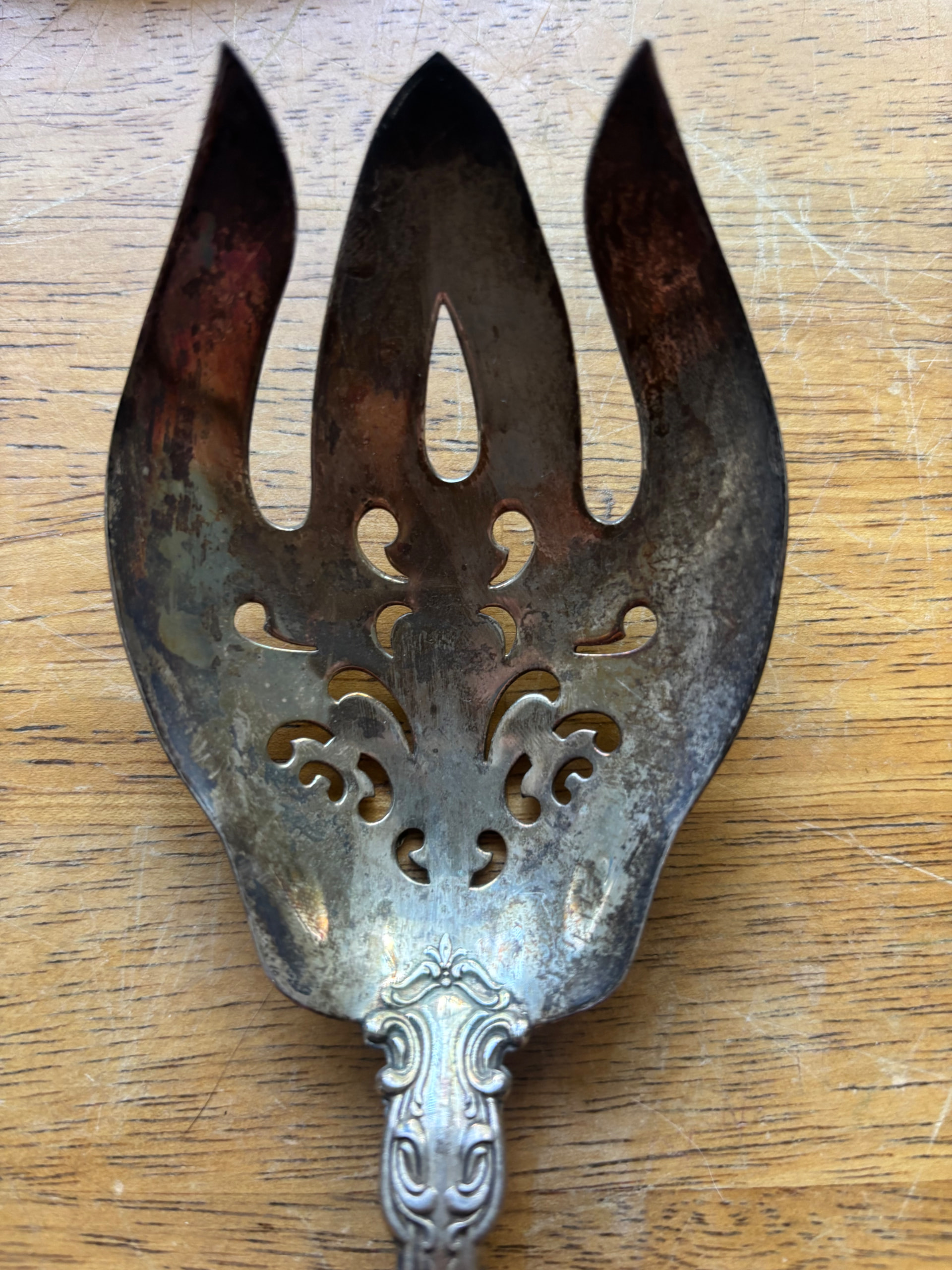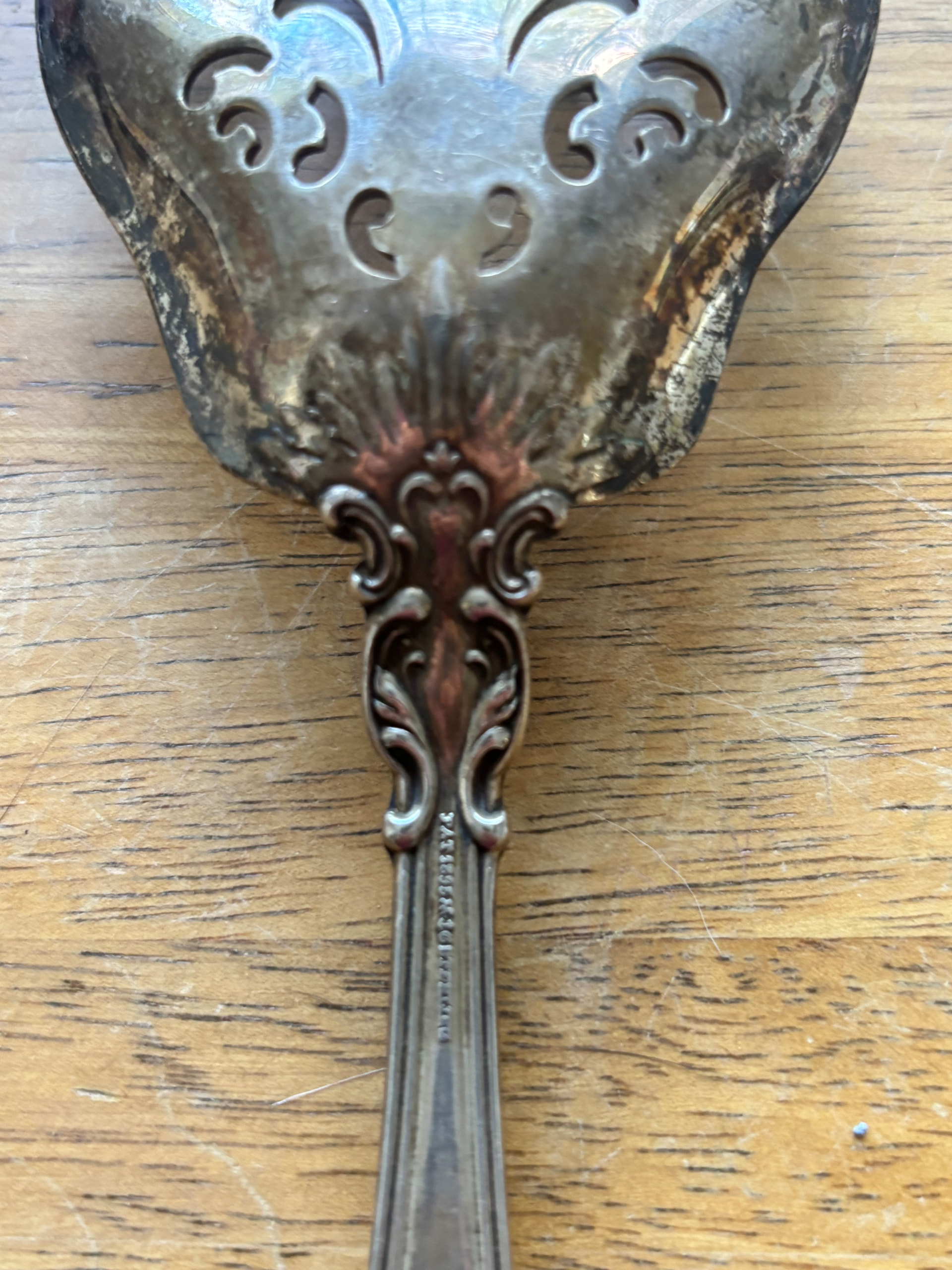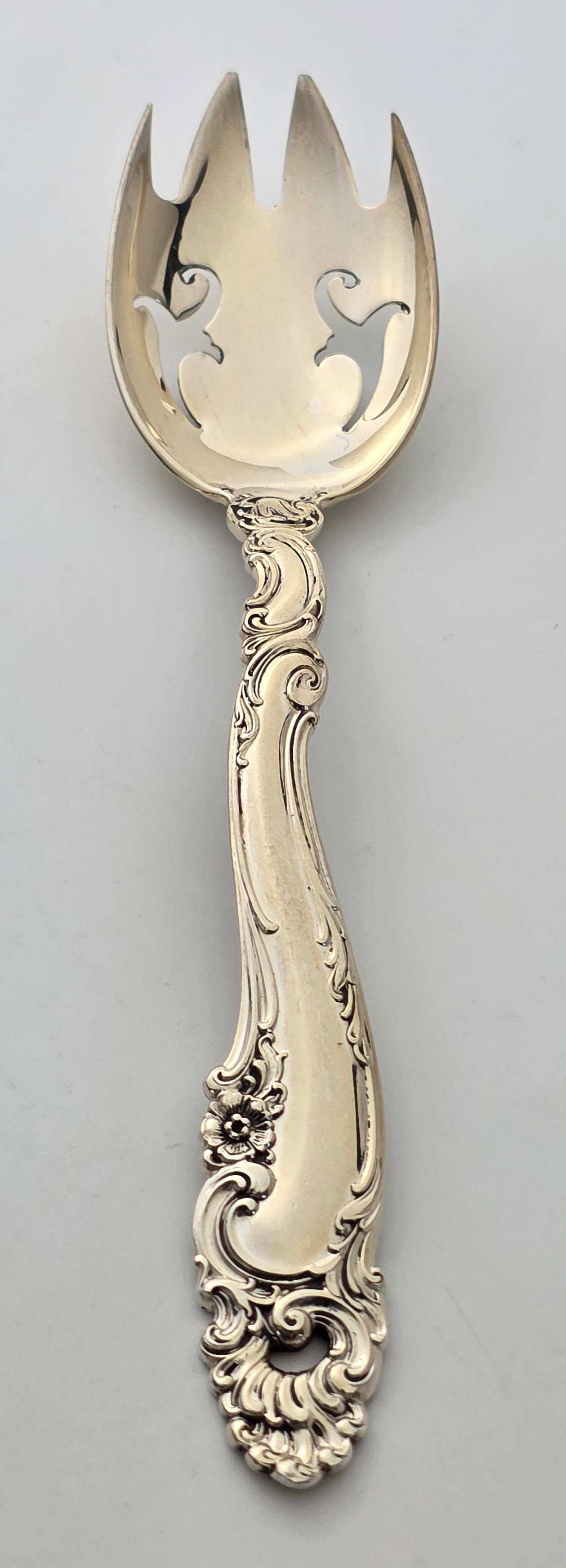 I have this Sterling serving fork. It is definitely Gorham Chantilly. It has an older mark (lion, anchor, and G) and has a very unusual piercing pattern. The ones I see on Google or eBay have a different piercing pattern. Any help on pricing, year, or anything like that is greatly appreciated.