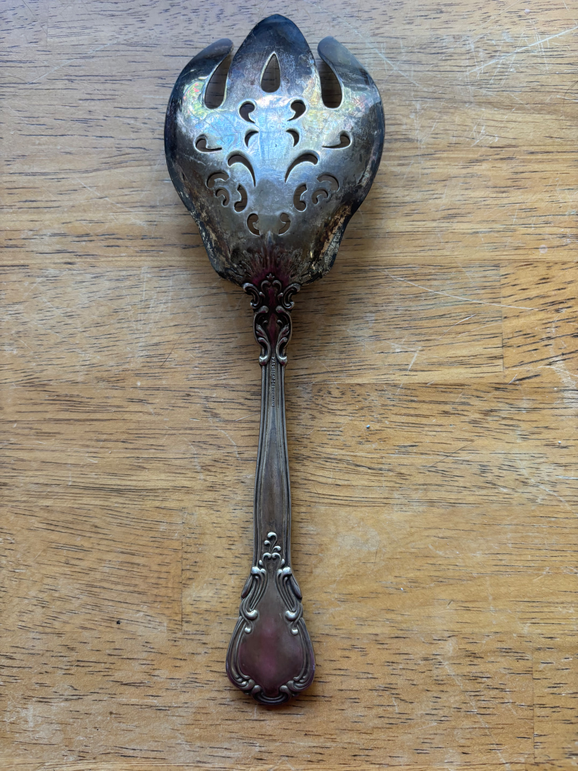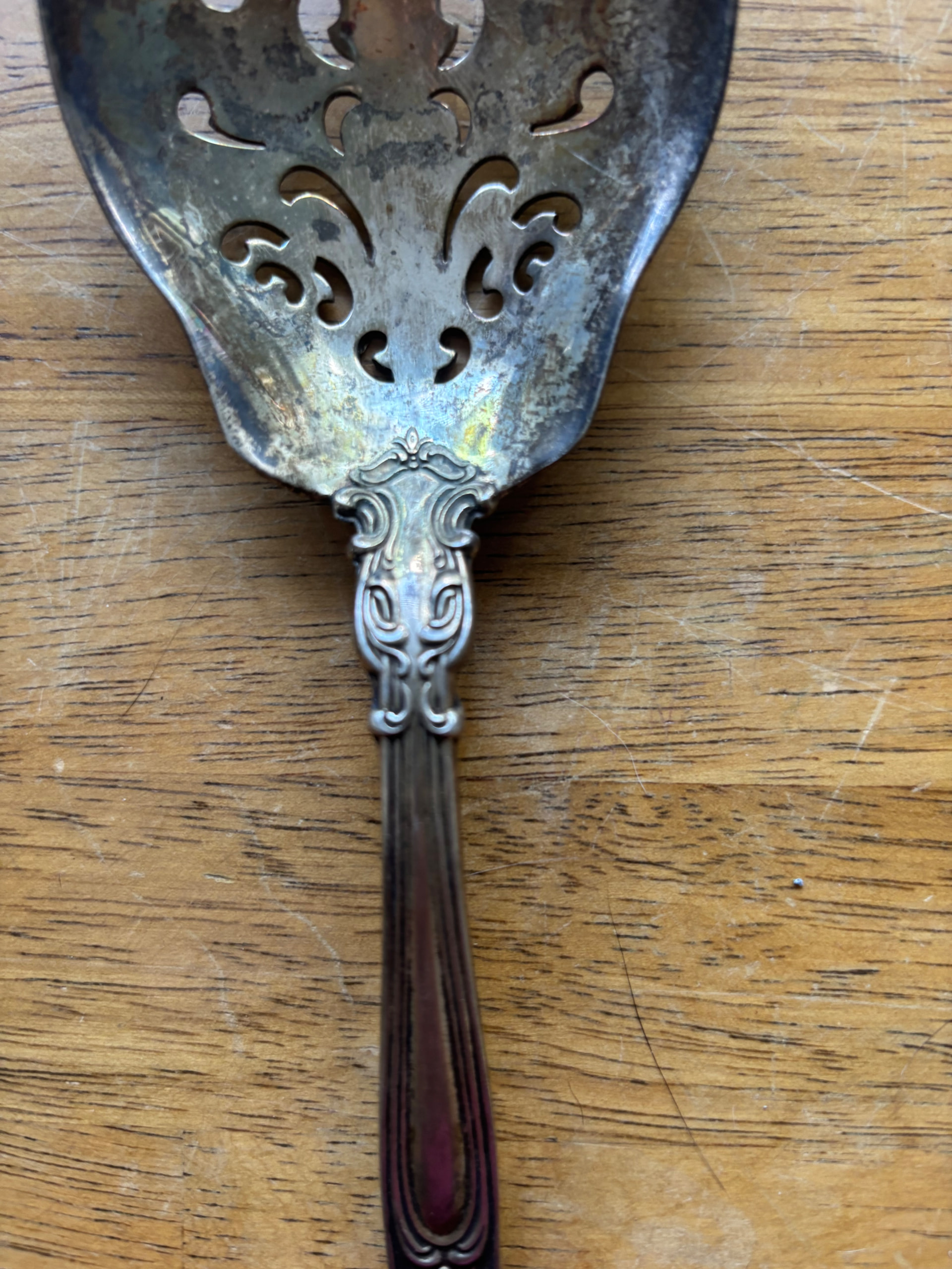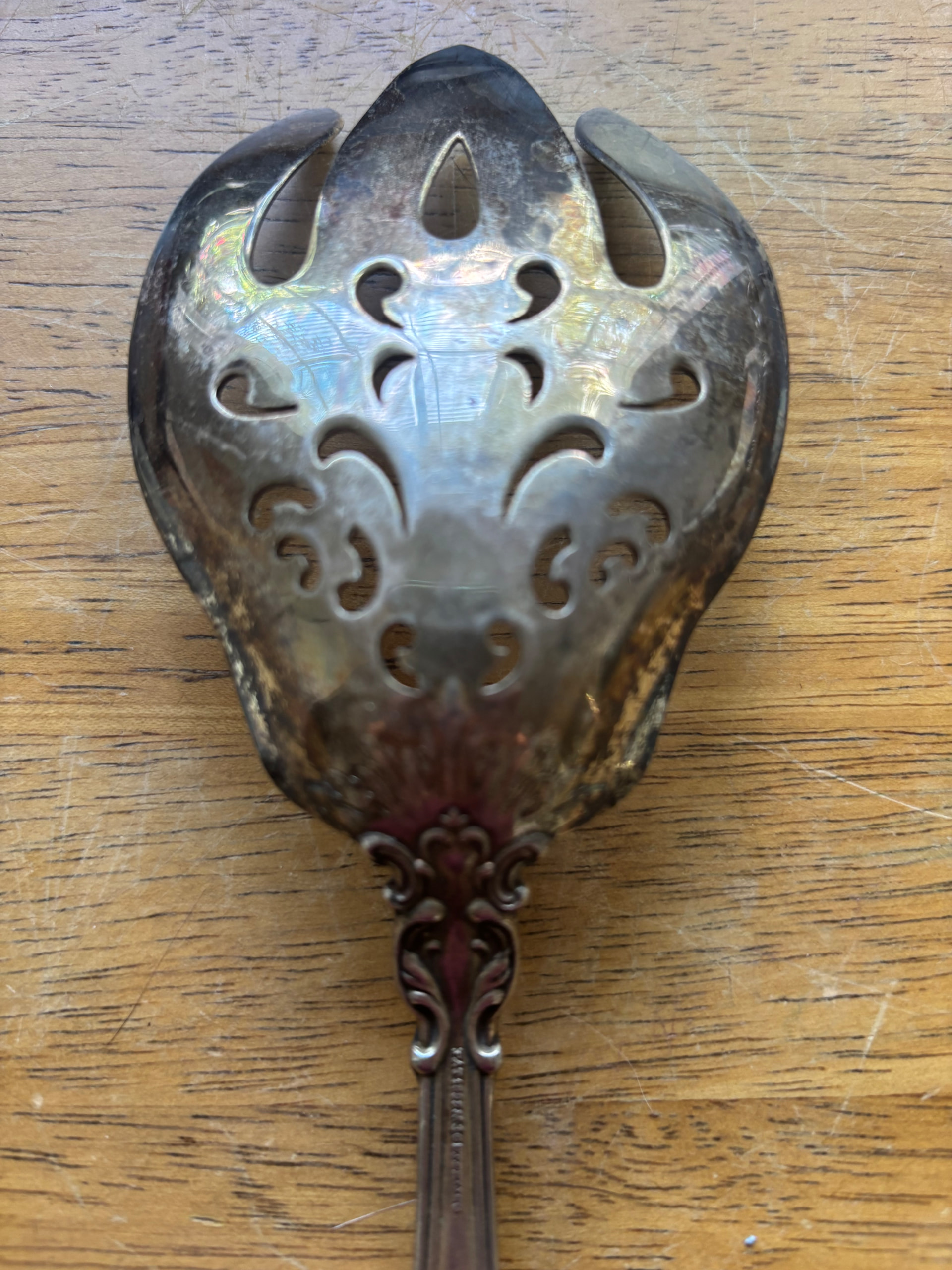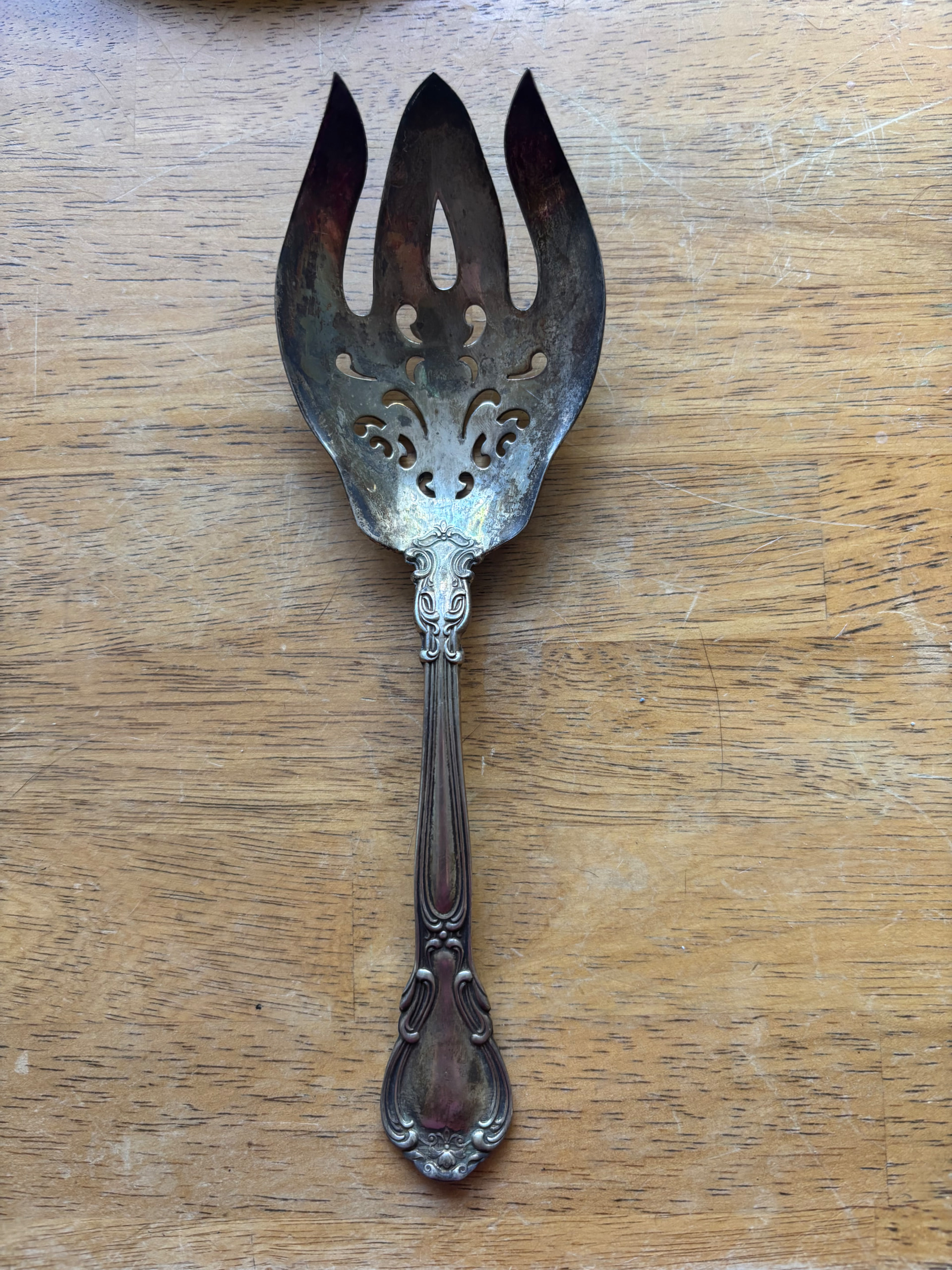 I have this Sterling serving fork. It is definitely Gorham Chantilly. It has an older mark (lion, anchor, and G) and has a very unusual piercing pattern. The ones I see on Google or eBay have a different piercing pattern. Any help on pricing, year, or anything like that is greatly appreciated.