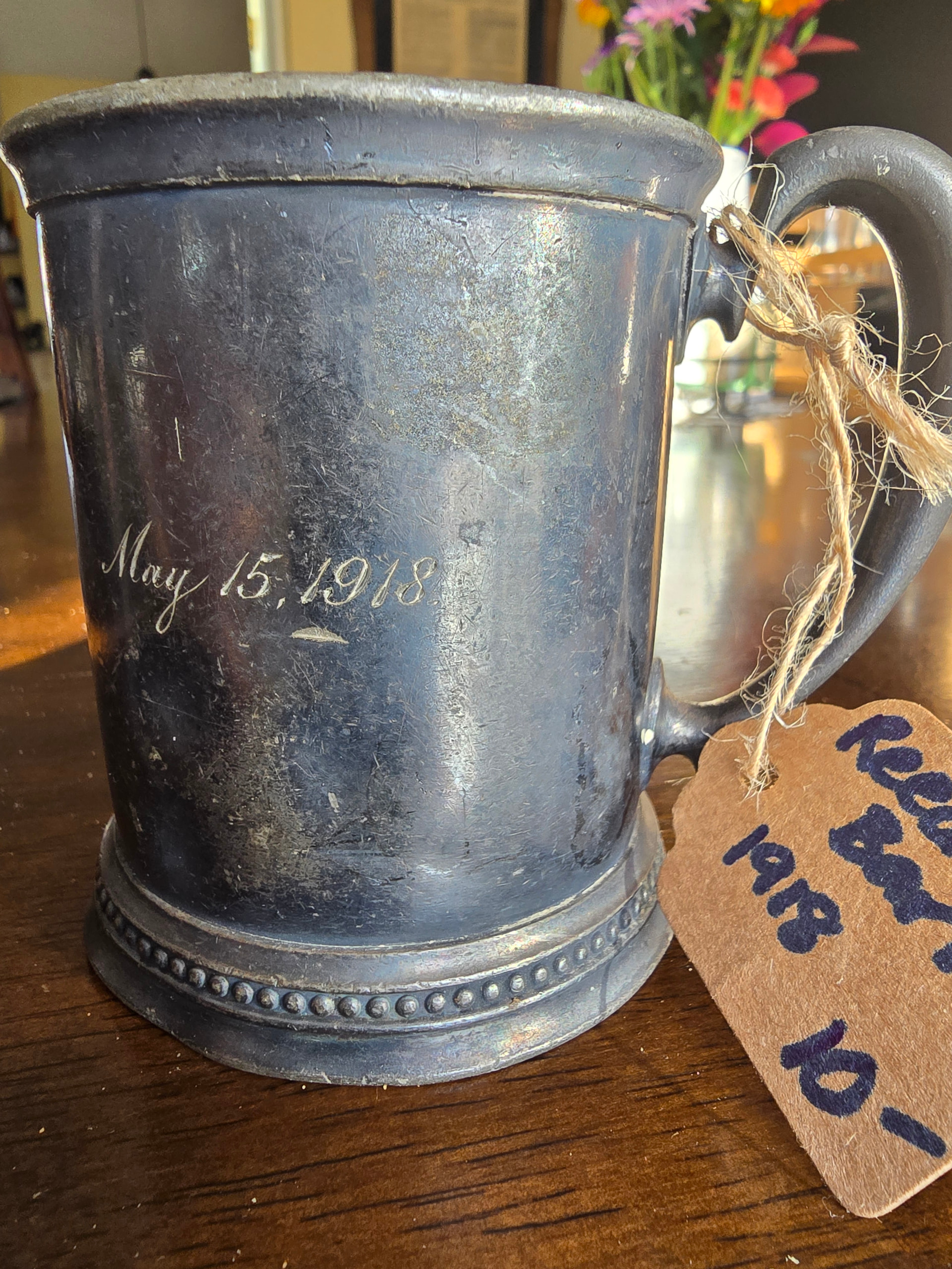 Your inquiry was regarding the date and initials. You have been told this is not silver, but looking at the deep inscription of date and initial it is not plated copper either but Britannia Metal which according to the label was at one point gilted although I can see no sign of any gilt left and rather wonder about that too.
