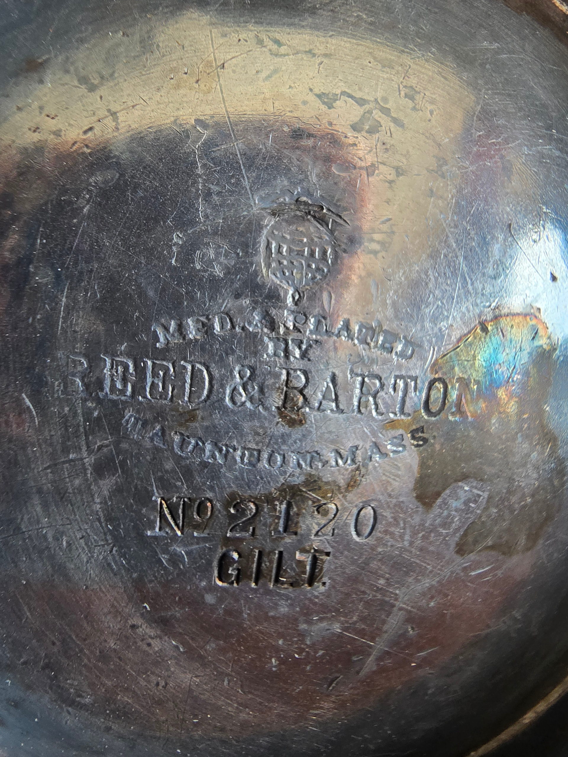 This one is Reed & Barton no 2120 GILT. I think it says Staunton, Massachusetts. Can’t read what’s above Reed & Barton. It also has the date of May 15, 1918 on one side & initials LOA.