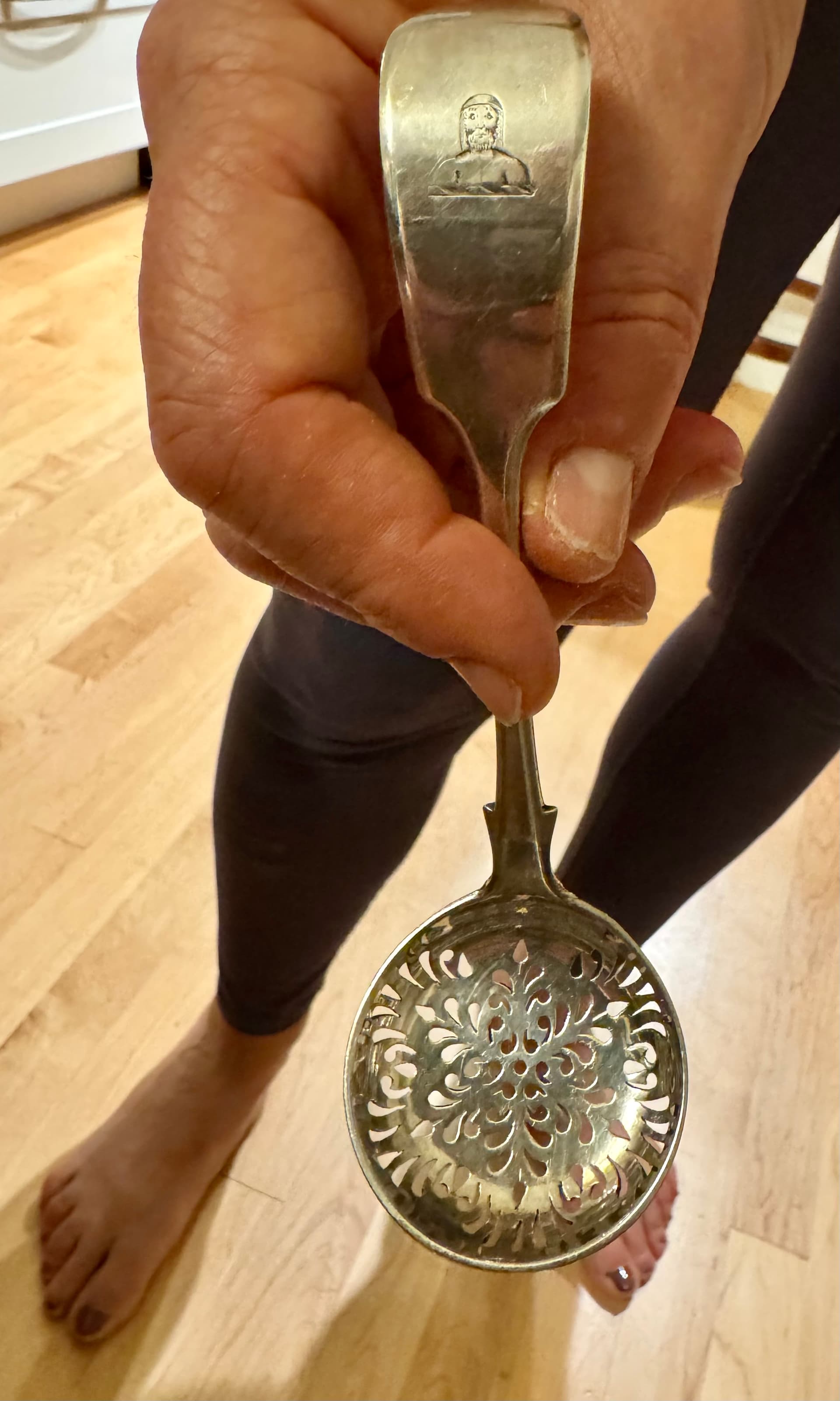 Hi! First time posting. I have a silver sugar sifter spoon, fiddle pattern, with hallmarks of John Stone, Exeter castle, standard mark 925 (lion passant facing left), duty mark of Queen Victoria, with date letter of 1845. It has a friar or other bearded male face (with hat/bandanna) engraved on the handle. I’d love to learn more about this engraving! Any idea what he represents, other than a friar of some sort? Is it part of an Apostle set? Thanks! Liz