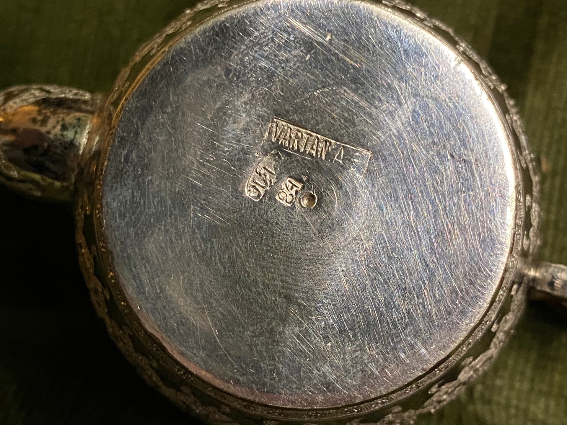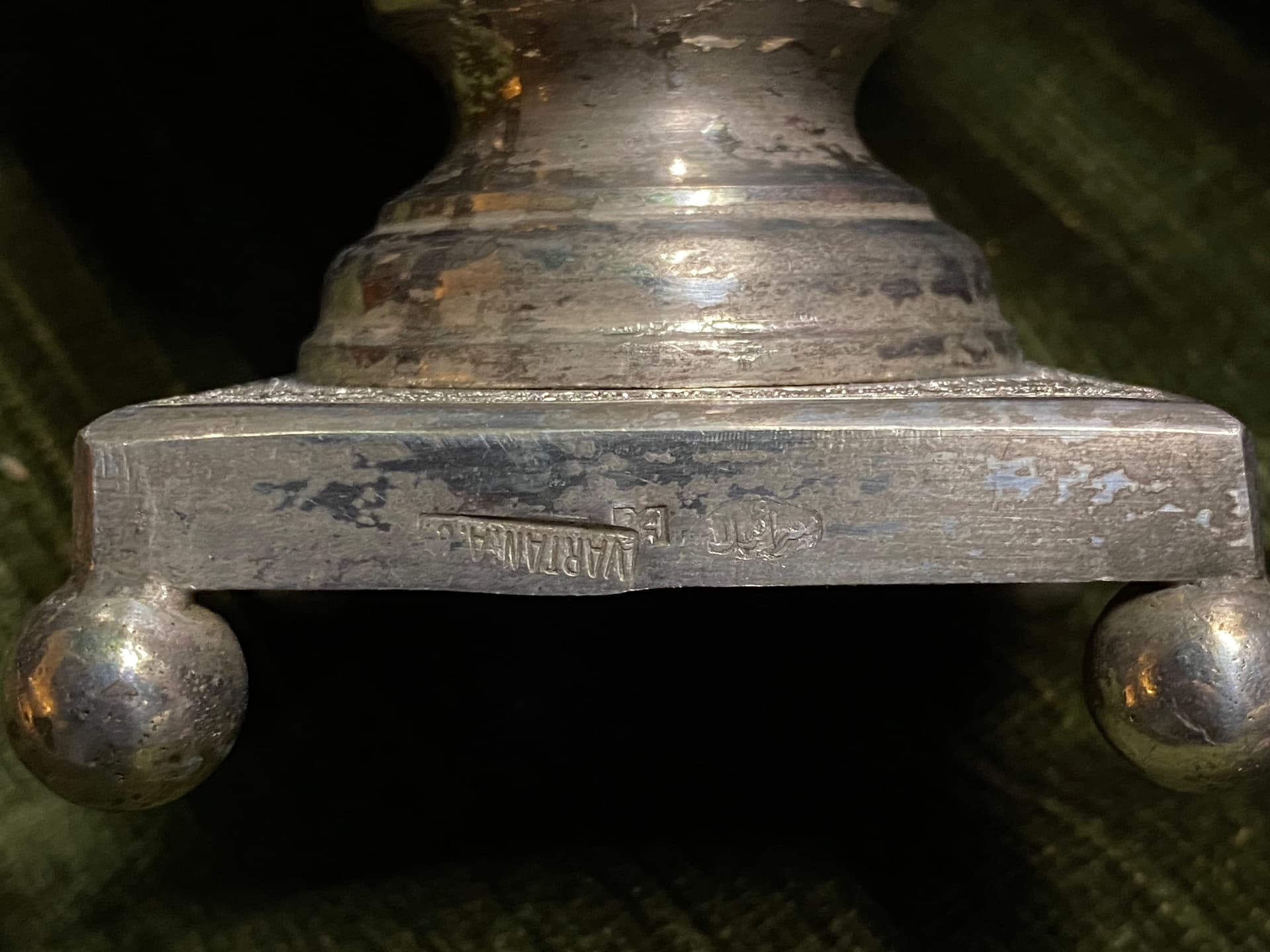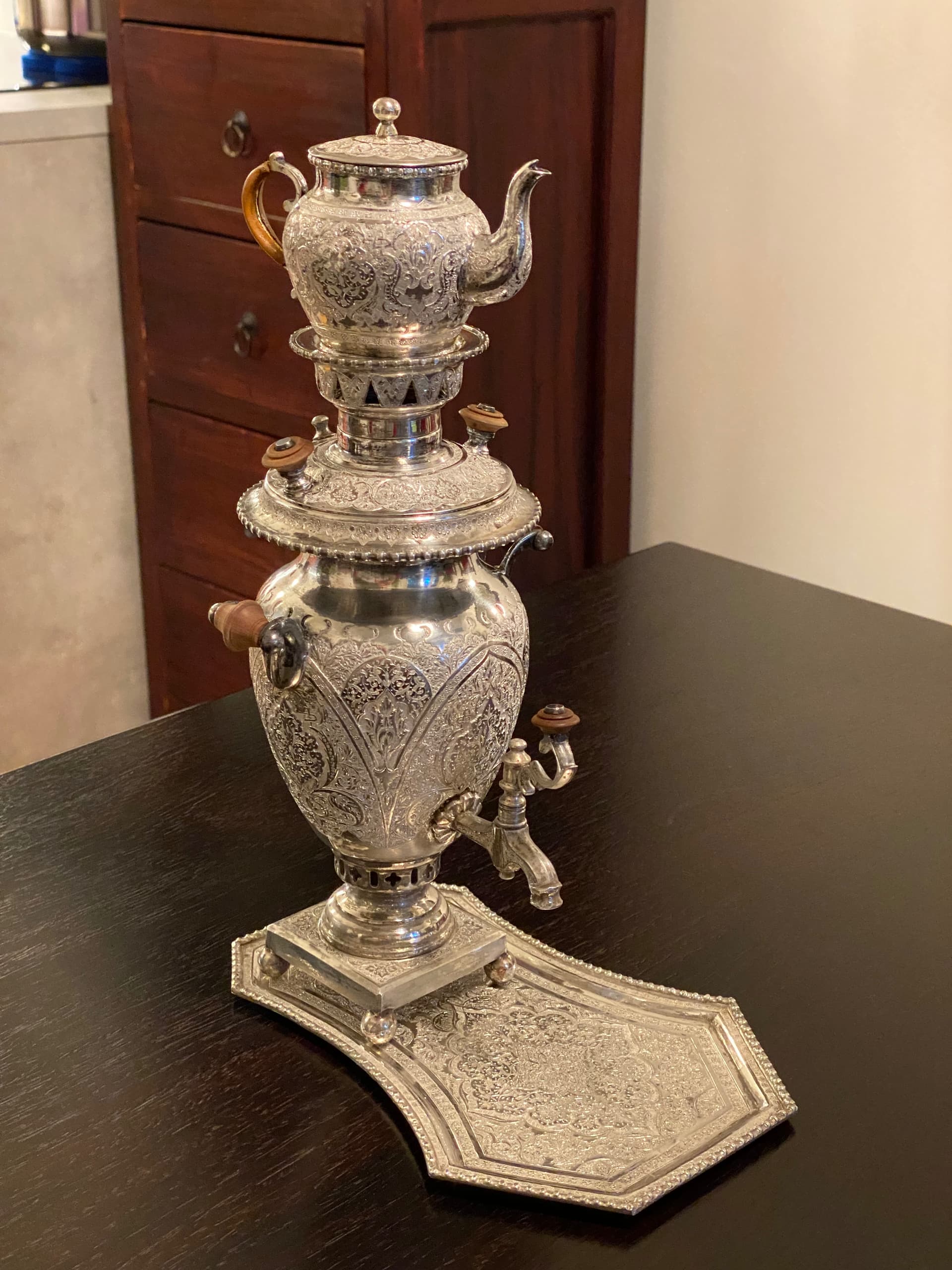 I have this ornate silver samovar with hallmarks which I haven’t been able to identify with any degree of certainty. The hallmarks on the bottom of the tea pot and in the base of the samovar read 84 (= .875 silver?), VARTAN.A, and something in Arabic script(?). Can anyone offer any information or clues as to where and when this was made?