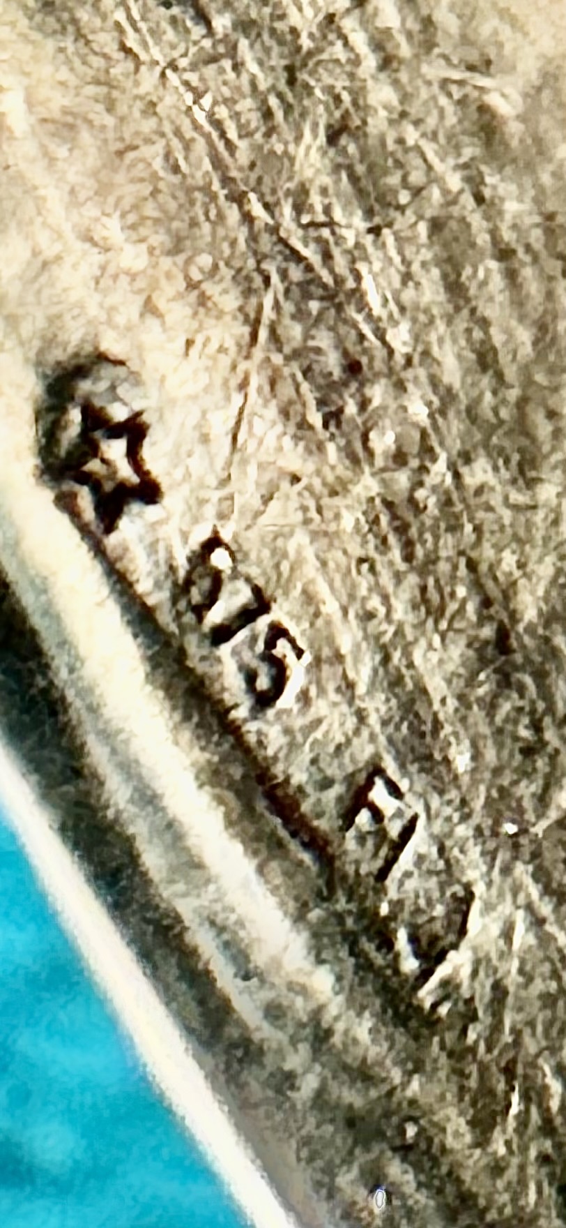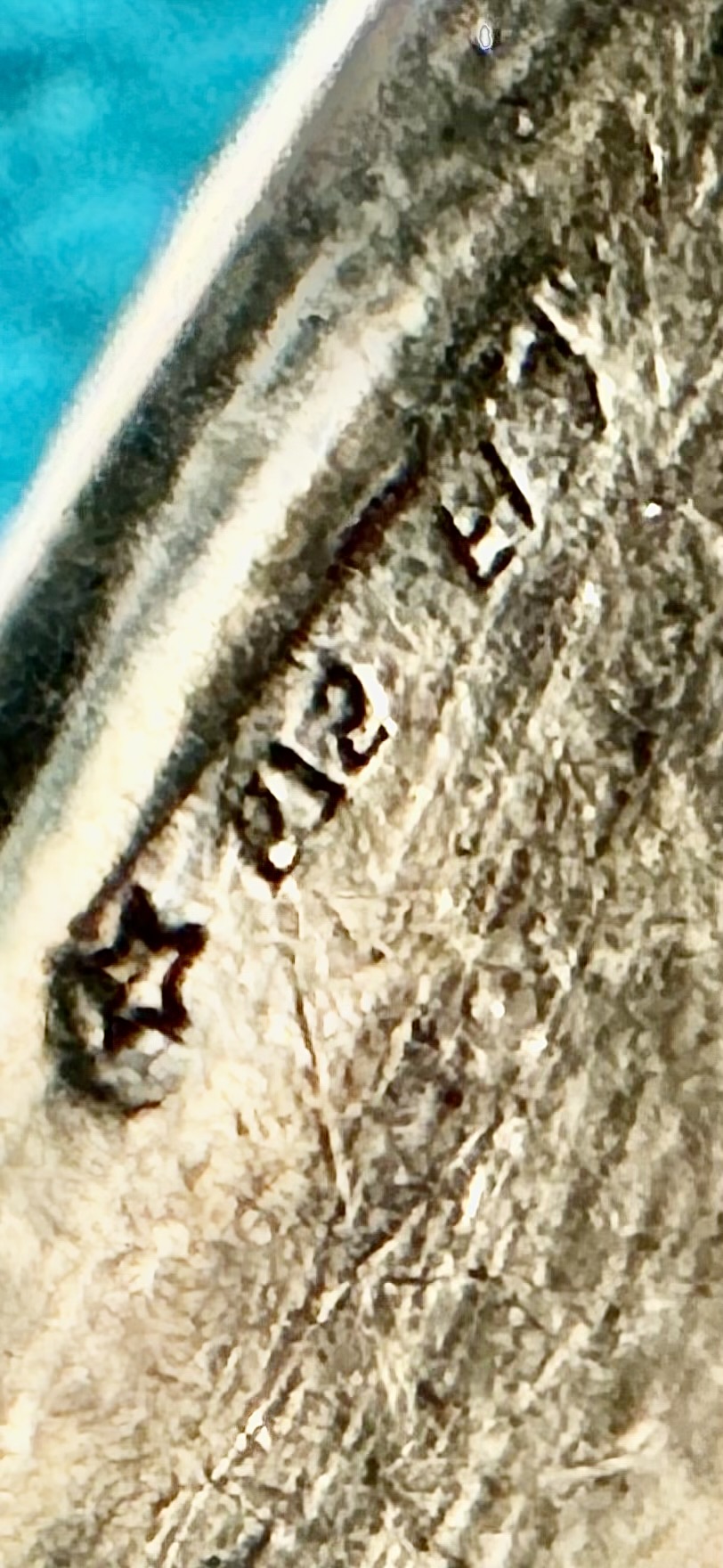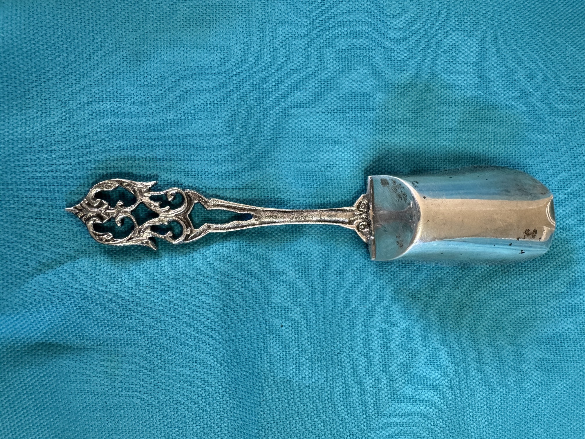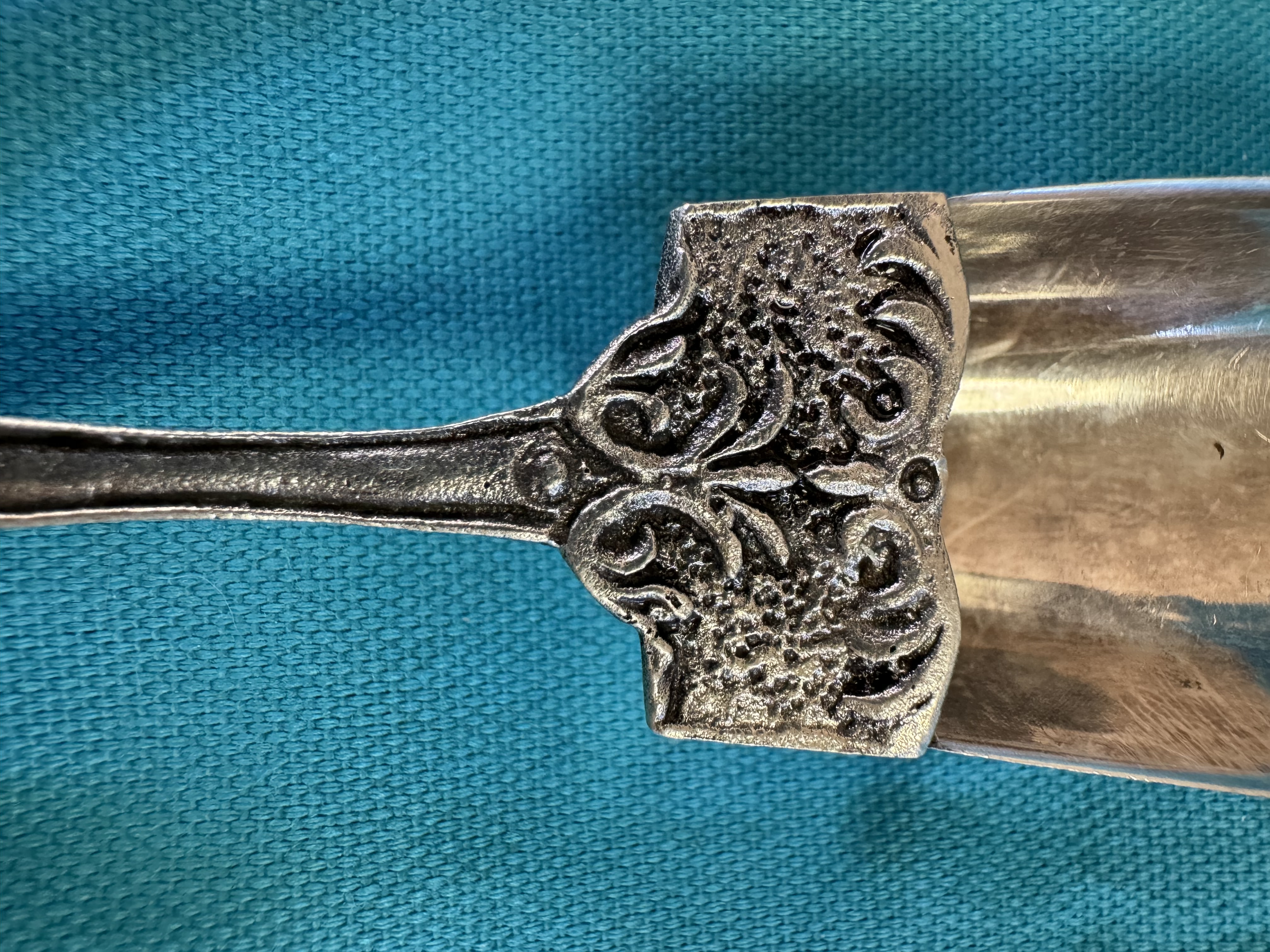 I was given my grandmother‘s silverware. This piece does not match the pattern of the others. I remember as a child that my grandmother told me that this sugar spoon was very old. I have tried looking up the mark that I found on the inside of the sugar scoop bucket, But have been unsuccessful so far. I cannot read all of the markings, but I hope someone can please help me!