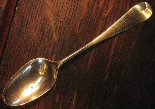 I recently acquired a small spoon with a collection of other silver items and am unable to find out when it dates from or who it is by. It is marked on the underside of the handle, but only with a lion passant and maker’s initials that seem to be ‘W’ and another letter I cannot quite make out. There is a monogram reading ‘E.T’ on the end of the handle on the underside which, to me, seems to be in quite an early 18th C. script style (although I may be wrong). There is a shell-like design on the reverse of the bowl if this helps dating it…