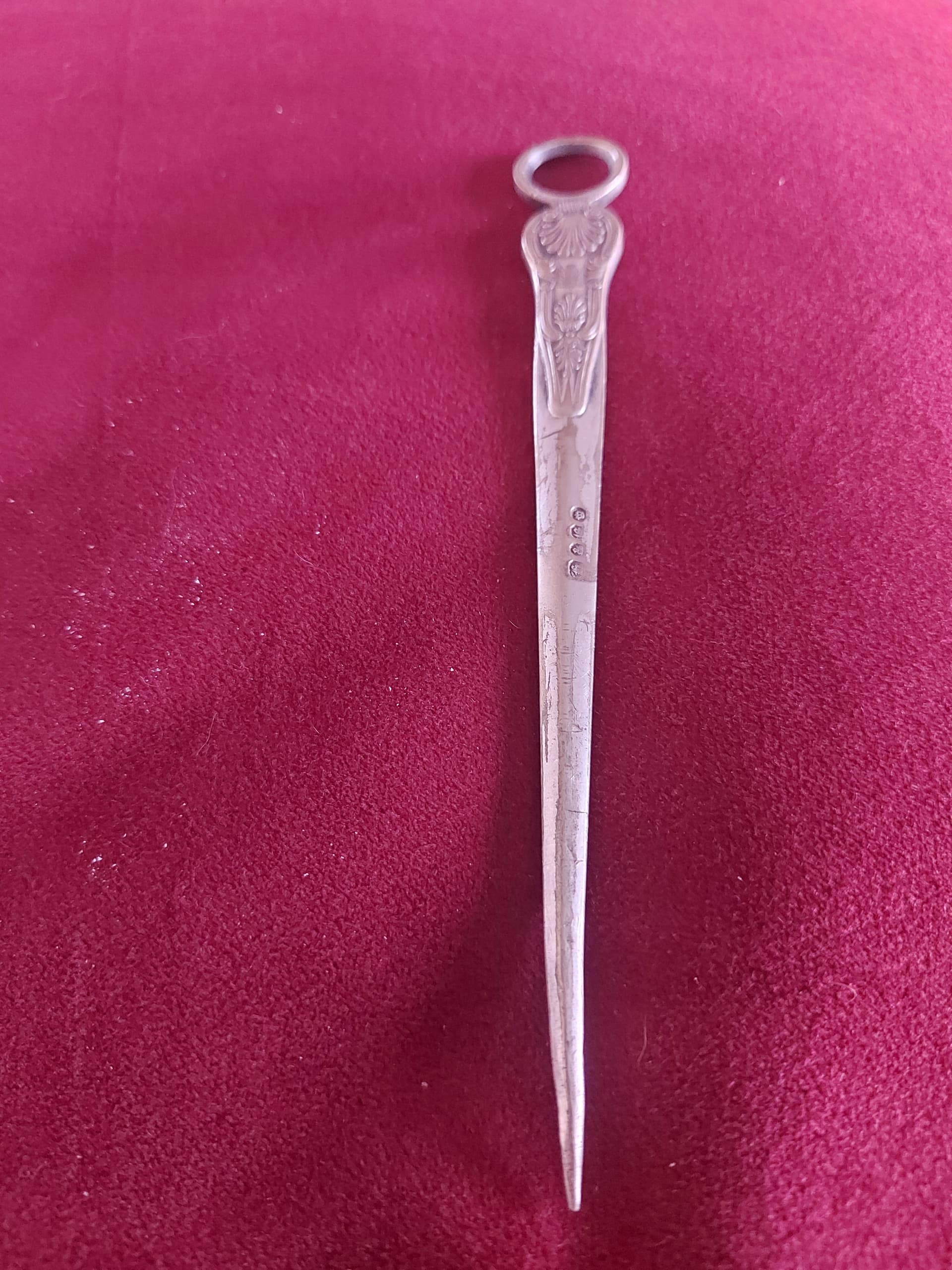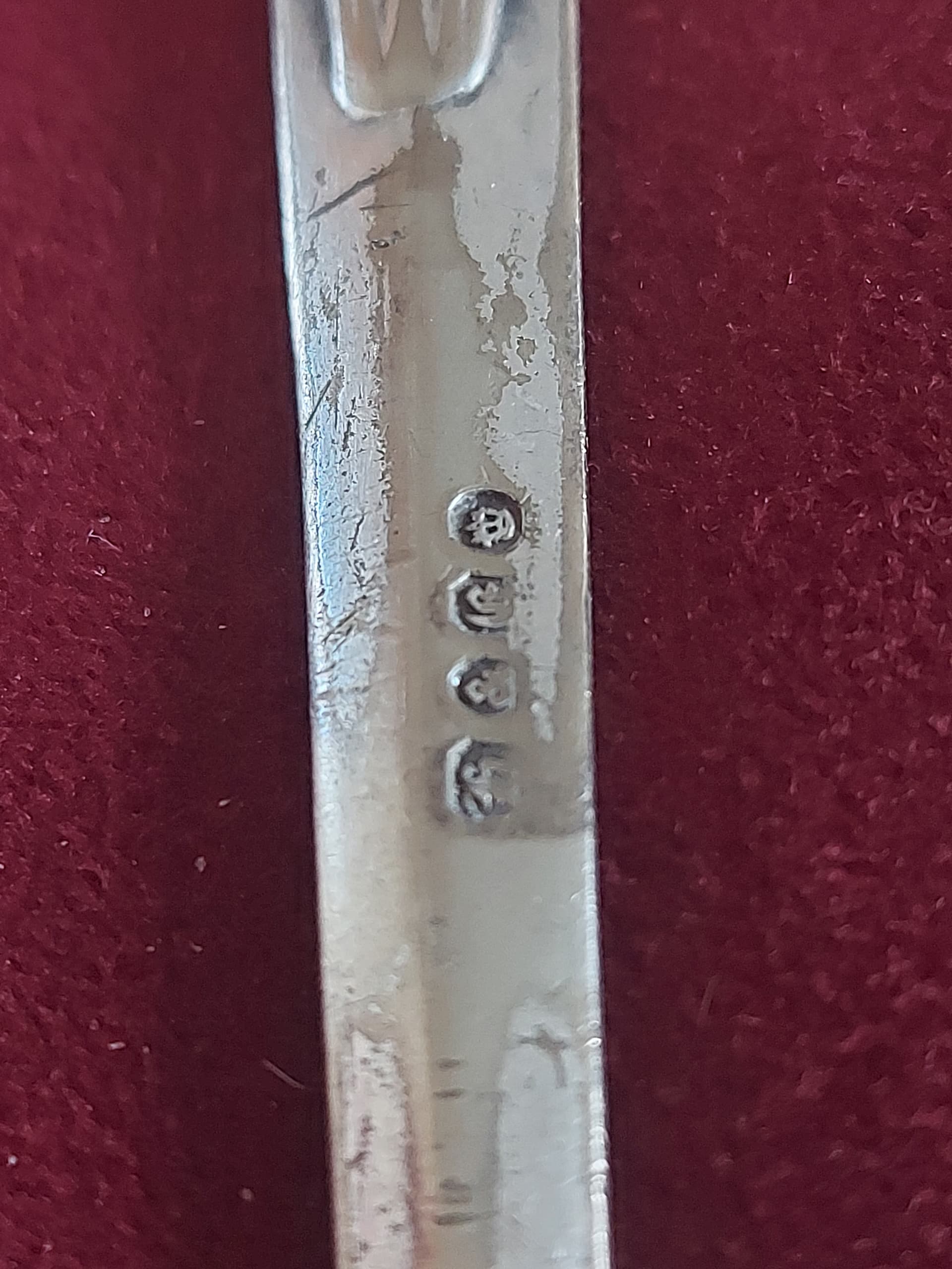 Queenâs pattern. silver-plated meat skewer with faux gothic lettering hallmarks reading H&E followed by a crown. If it has any other marks or initials your illustrations donât show them.