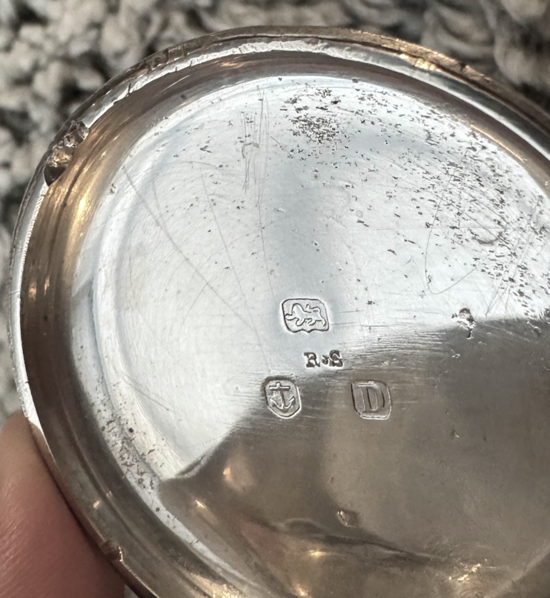 Wondering if anyone can help me identify this pocket watch hallmark. It’s a family item, I’m not concerned with its worth particularly just looking for a little more information about its time period. From what I can understand it is Birmingham silver but I’m struggling to match the letter D to the hallmark guides online. And also can’t find any more information about RS.