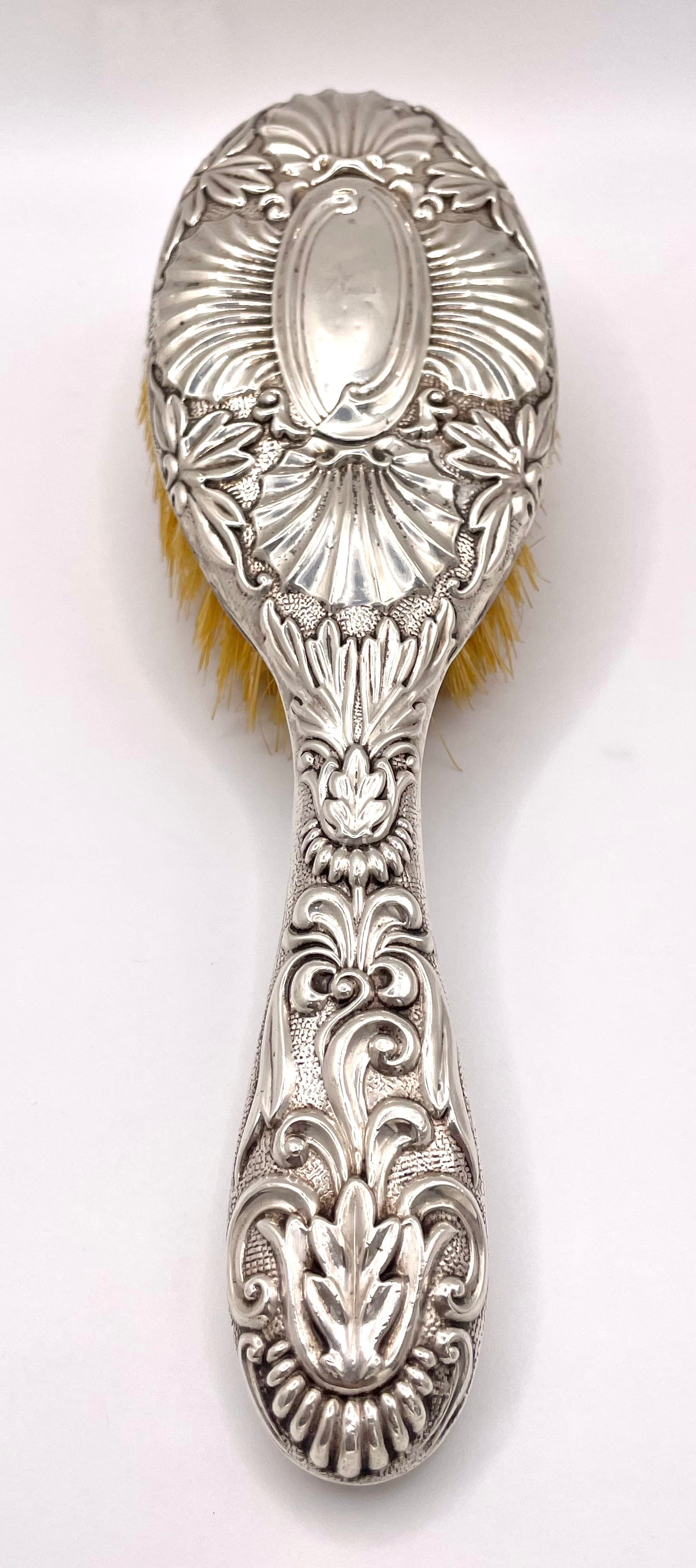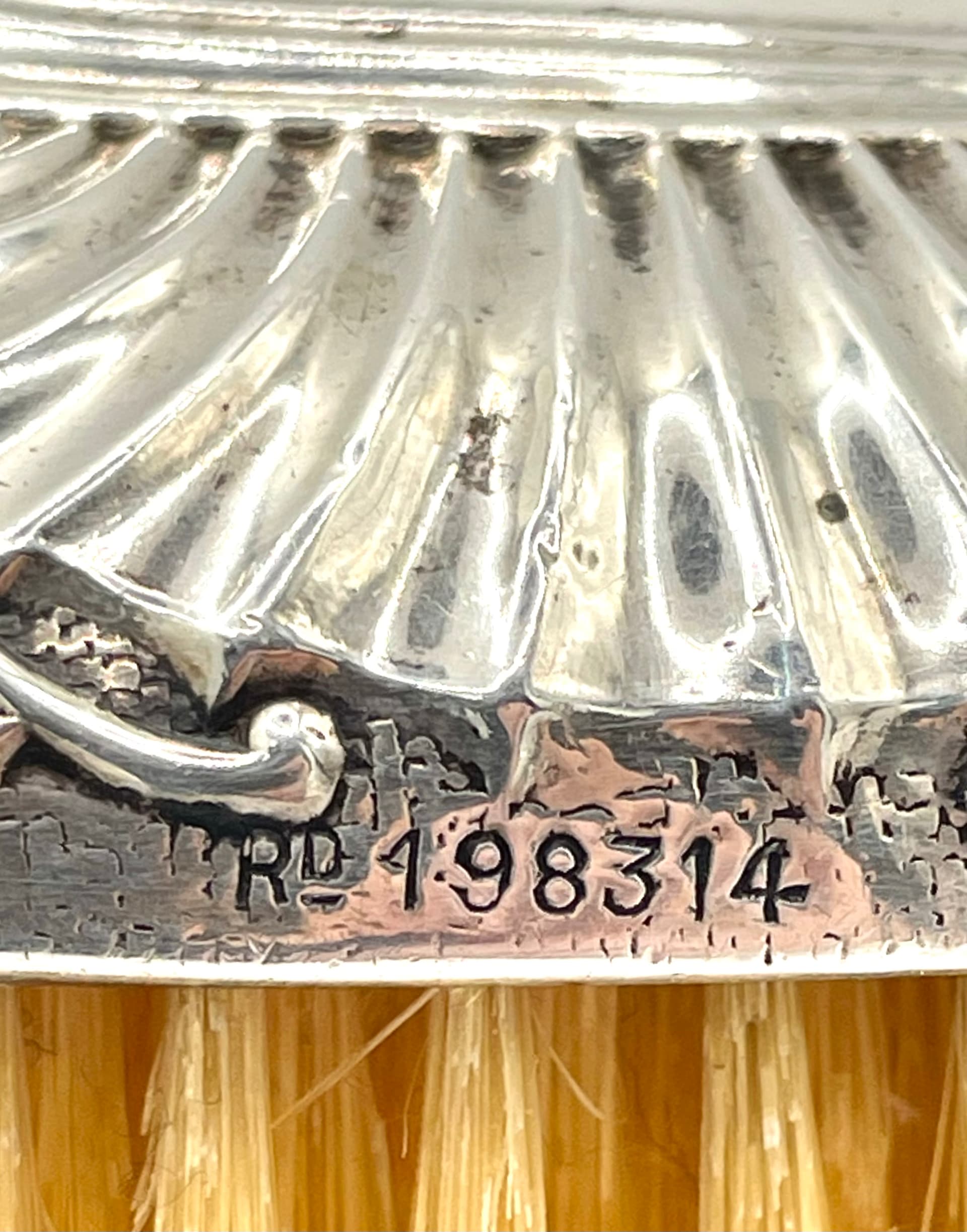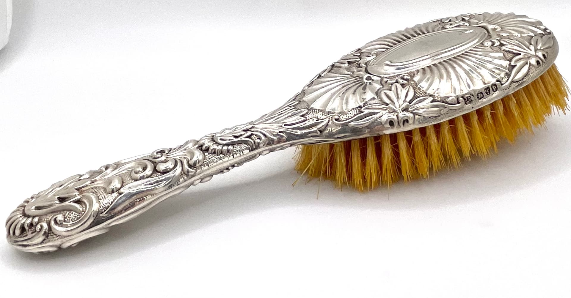 Now, apropos the hairbrush itself which you have thoughtfully displayed with such detail we can see the broken badger or boar bristles; it is a quite marvellous pattern and likely part of a complete set of brushes etc for a lady’s boudoir which may well include hand mirrors, comb cases and holders, button hooks and clothes brushes. Do you have the rest of it?