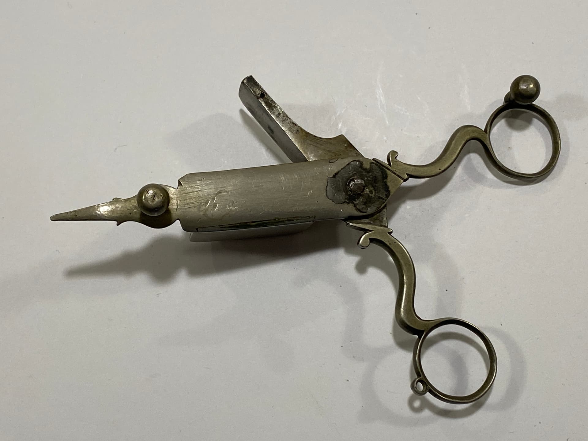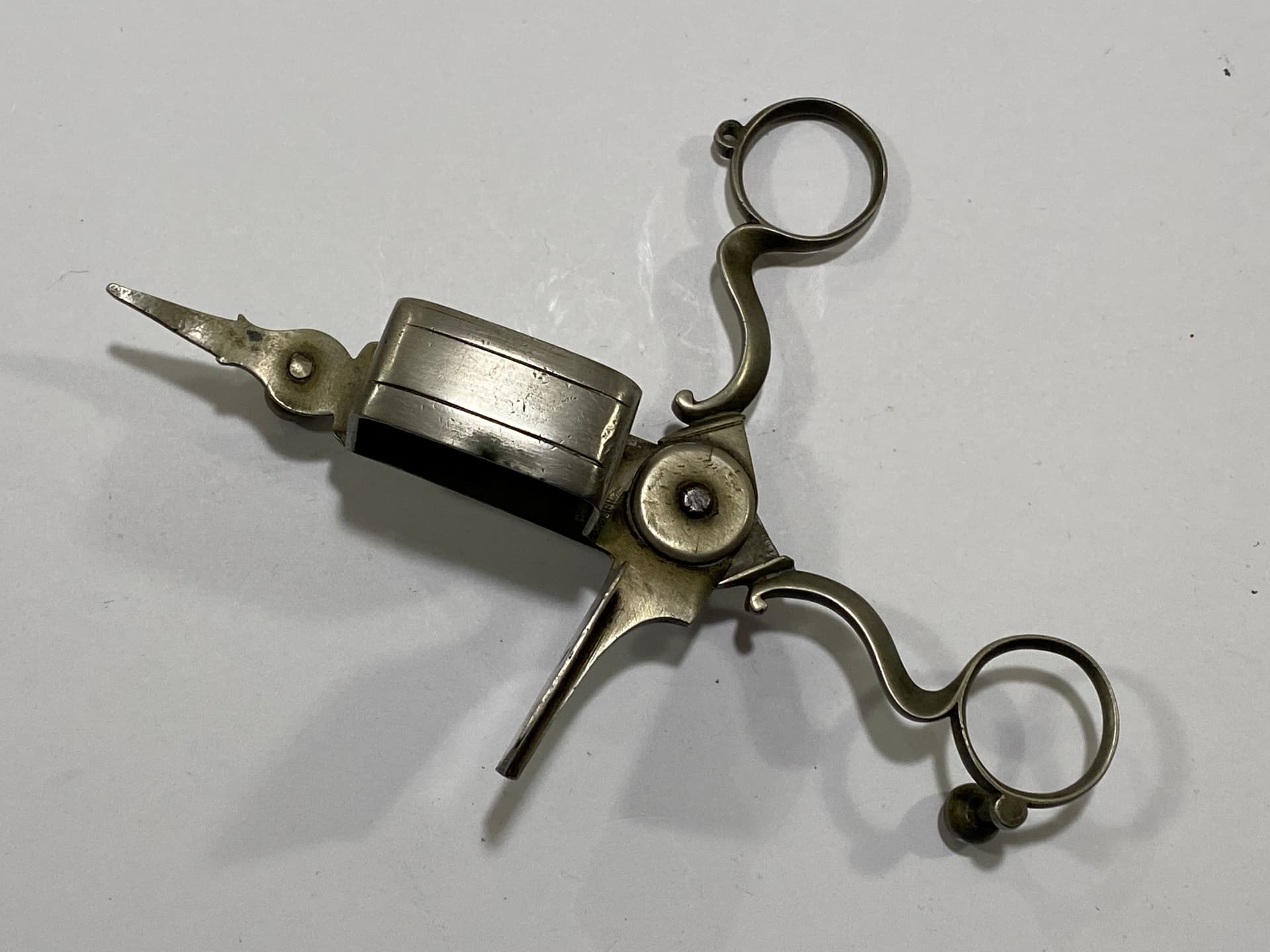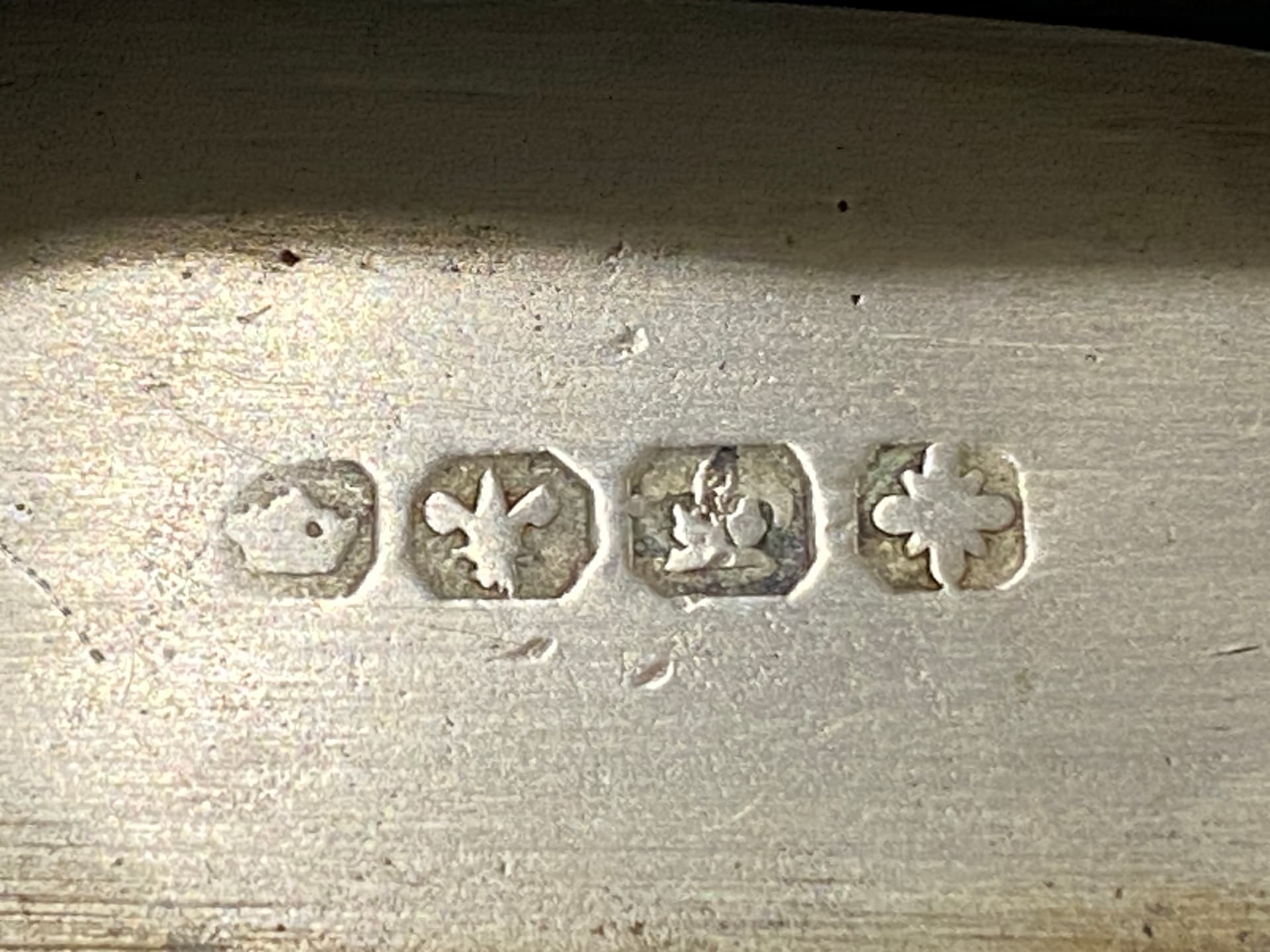 It also doesn’t appear to contain any of the recognized sterling marks of other countries. So, it’s almost certainly silverplate. But without any hint about the maker’s name, identifying it will be a matter of sheer luck. Someone might recognize those pseudo-hallmarks, but with just a few random punches, there’s no place to start the search.