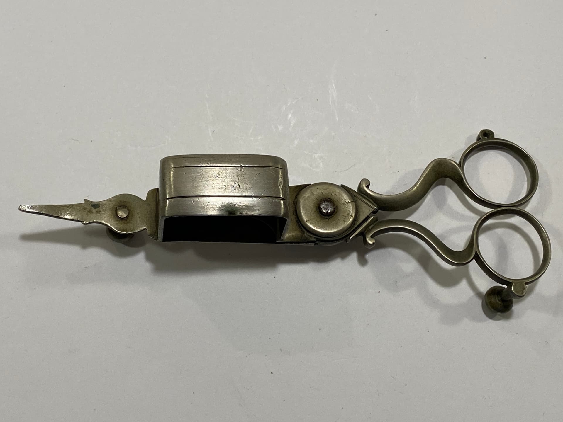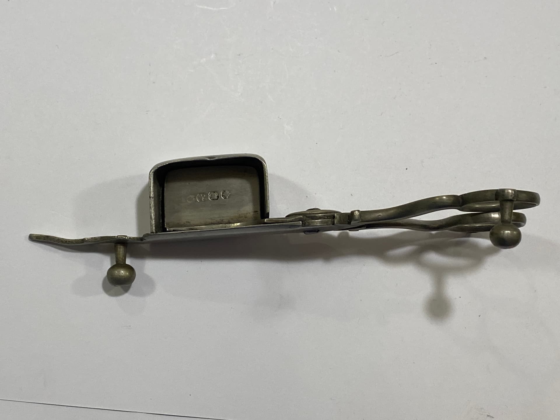 I recently received this candle snuffer in a group of items from an estate auction. So far i have been unable to find anything on the hallmarks. I am thinking that it is silver however I have not been able to identify the marks. Any help with identifying it and dating it will be greatly appreciated.