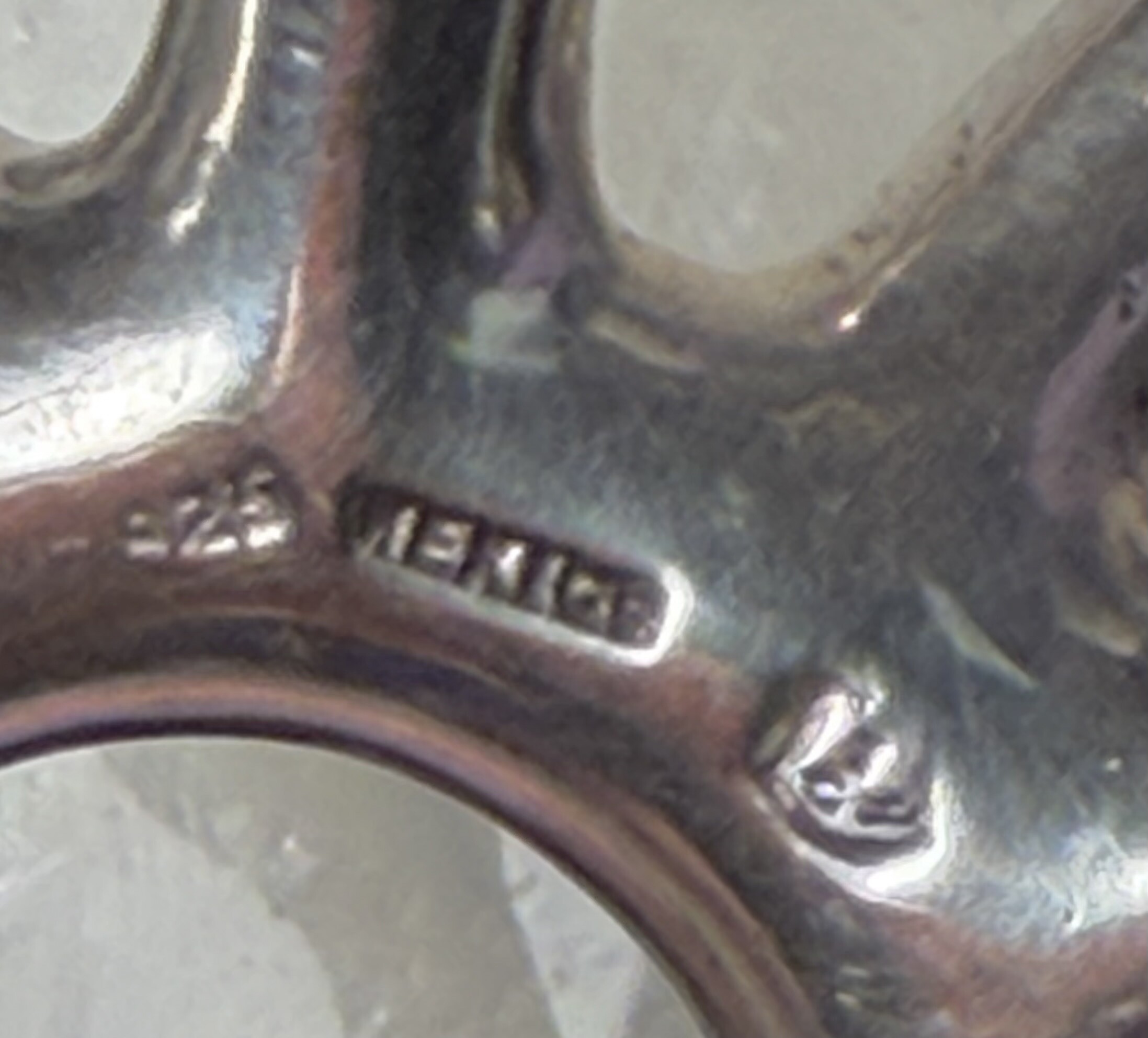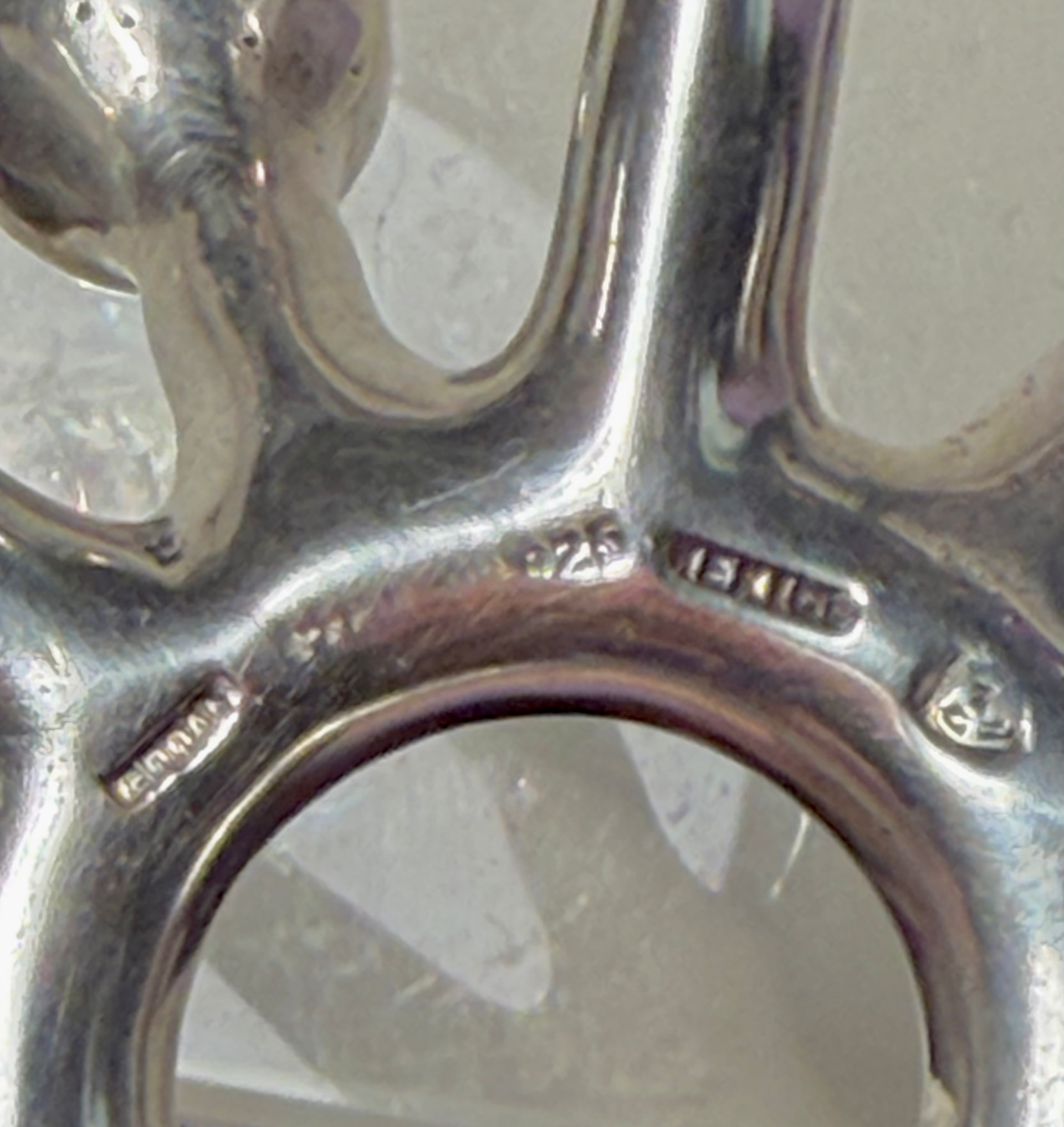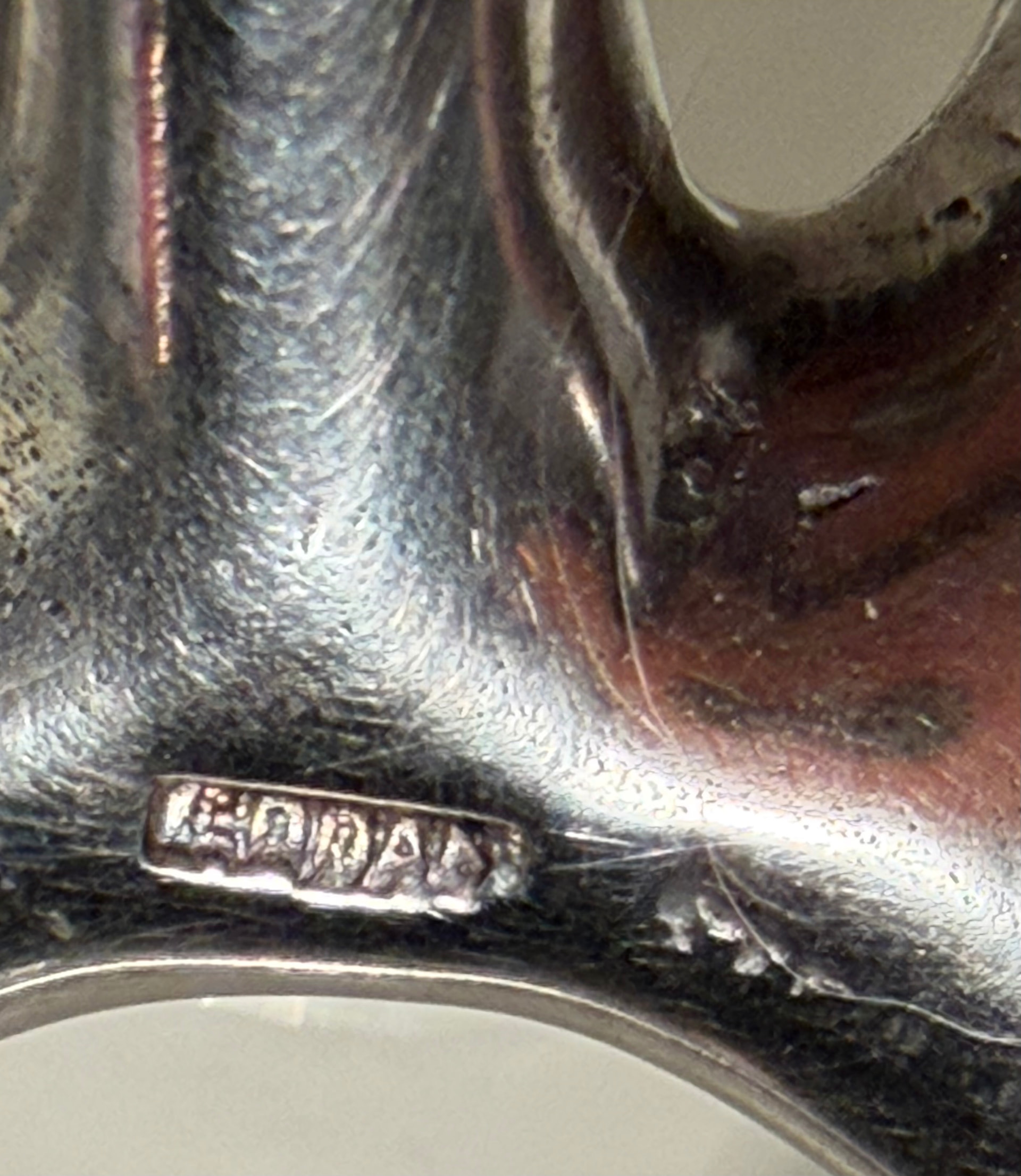 This one looks very similar, but is made of 925 Mexico silver. Jens’ design is often referred to as a “spider” or “Sputnik” candle holder. I see the eagle mark, but can’t read the number. Would someone have copied Jens or did Jens copy the Mexican artist? Thank you!