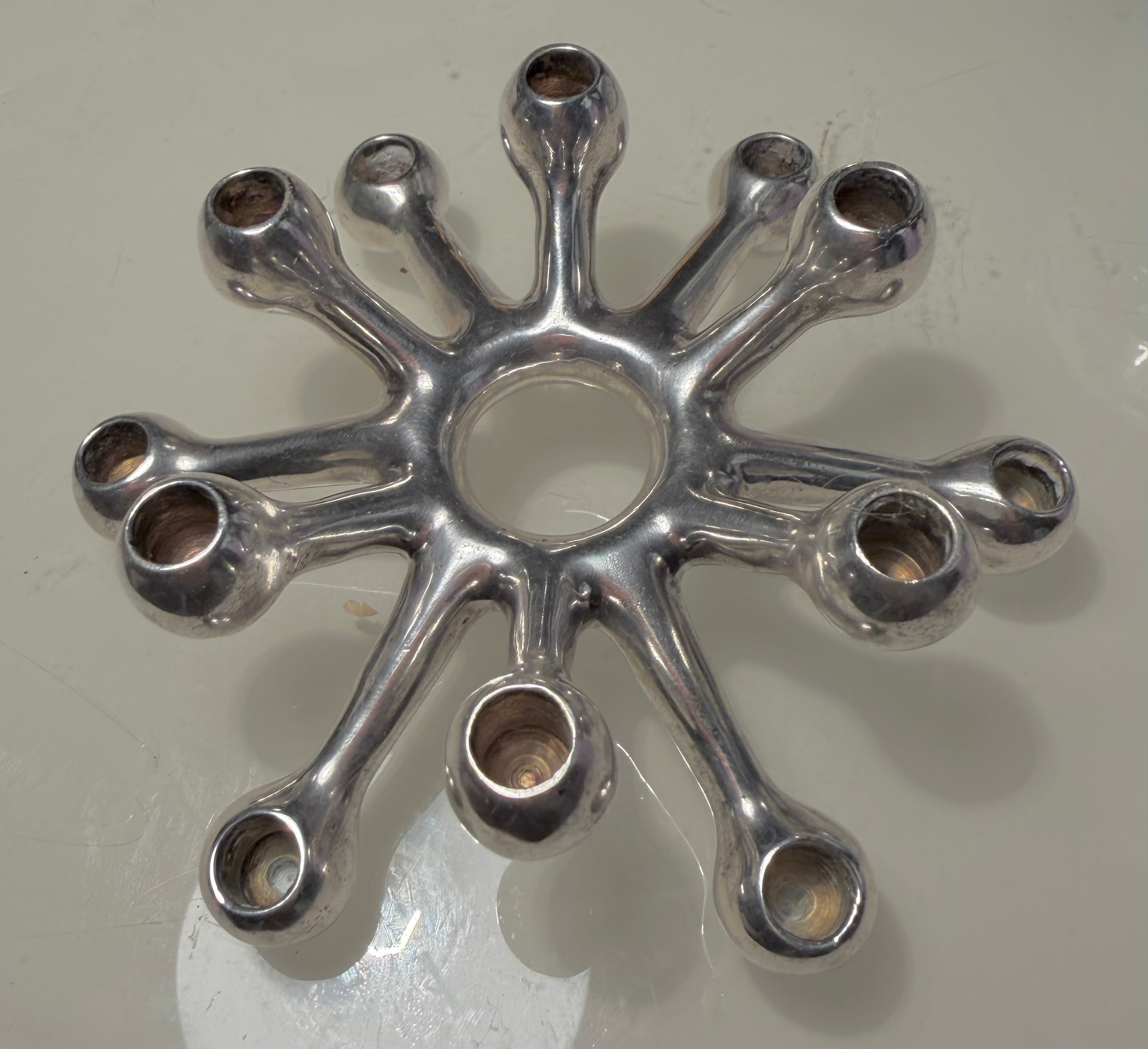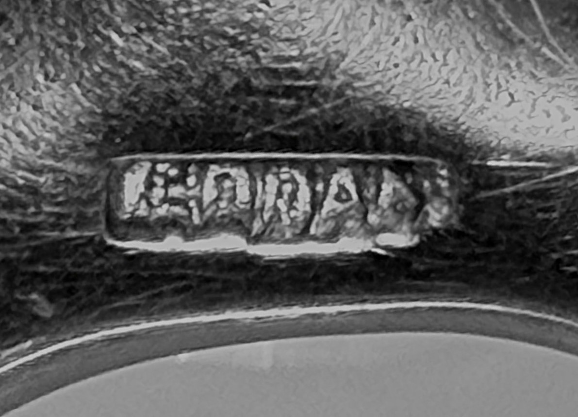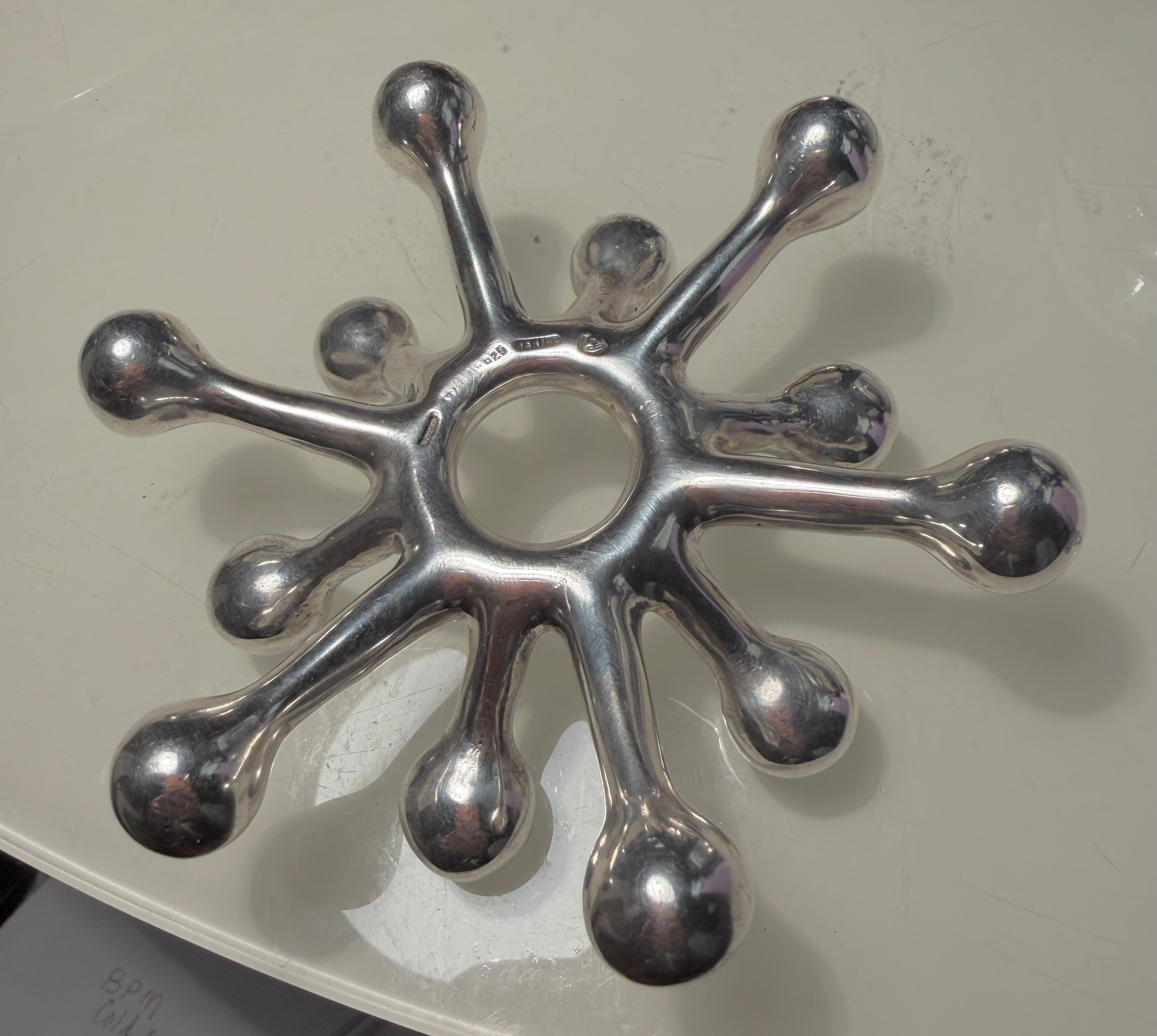 This one looks very similar, but is made of 925 Mexico silver. Jens’ design is often referred to as a “spider” or “Sputnik” candle holder. I see the eagle mark, but can’t read the number. Would someone have copied Jens or did Jens copy the Mexican artist? Thank you!
