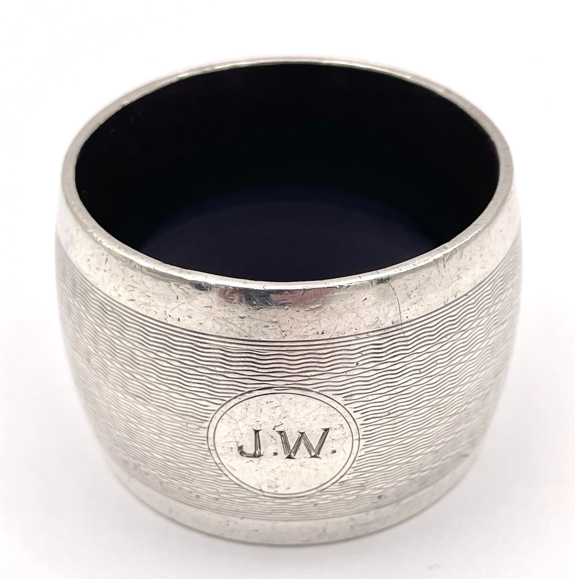 Hi! I’ve got a very unusual napkin ring. The outside is hallmarked silver, but the inside is a mystery. It was sold to me as being Bakelite, but it doesn’t smell at all (Bakelite has a very distinctive smell). It has very rubbed hallmarks where I cannot work out the maker. I also cannot work out the assay office. I think the date letter is an upper case E. Any help would be greatly appreciated, thanks.