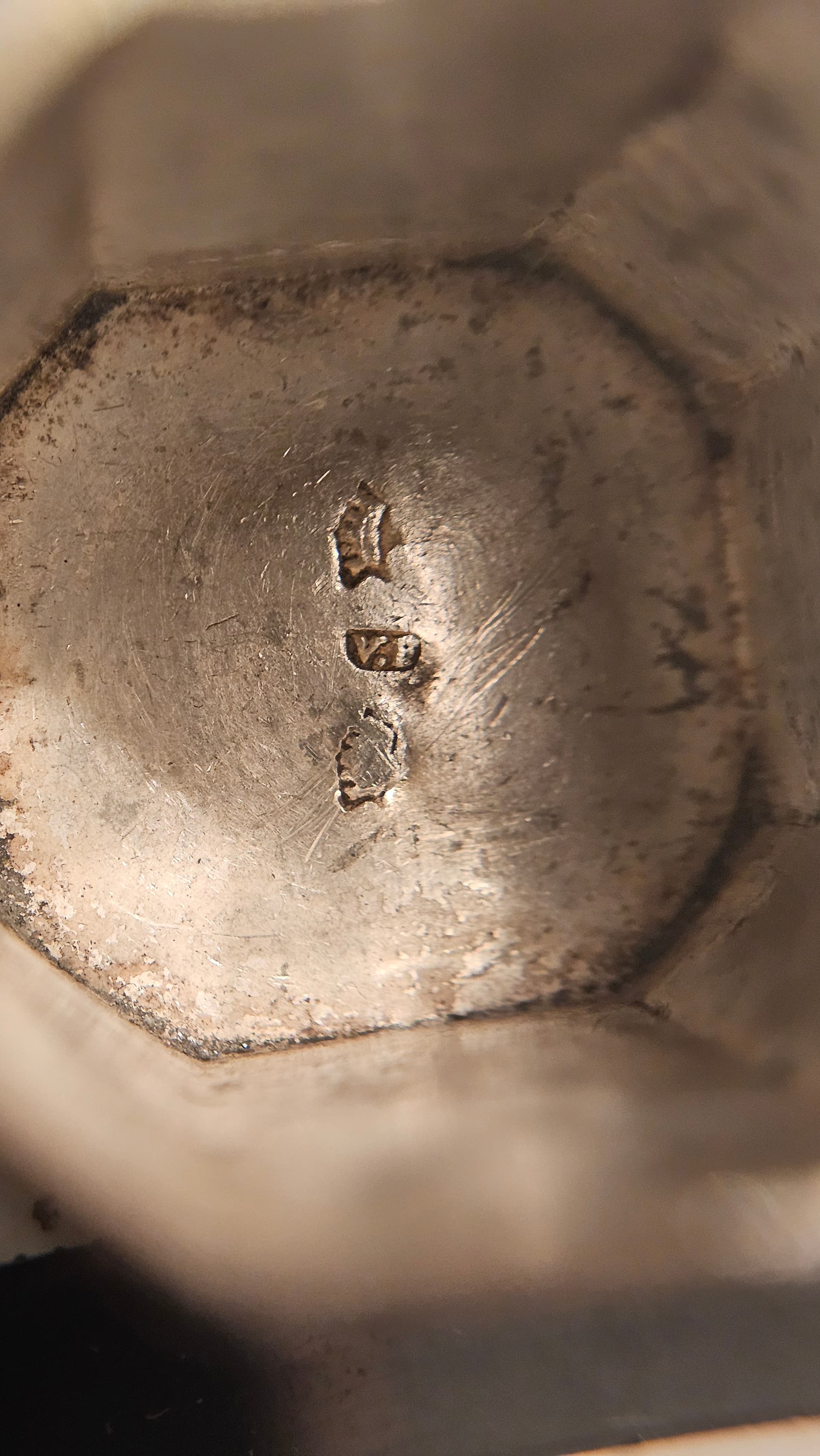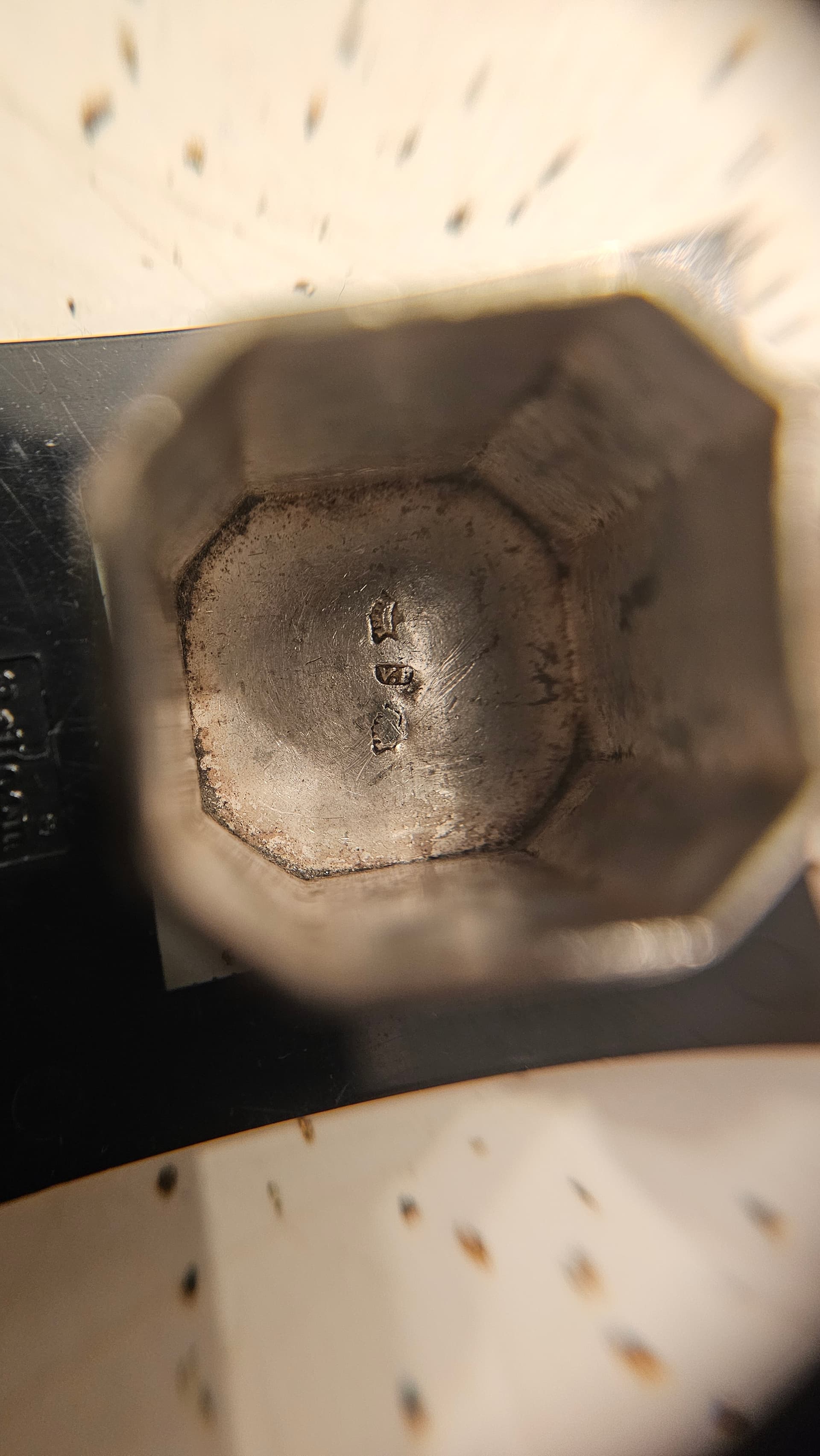 This piece however, no matter how many hours I spend searching haven’t been able to identify. I’m hoping someone here will recognize the hallmarks. There are 2 crowns and letters on the bottom interior and another little mark on the bottom exterior. I found a site with 2 similar objects describing them as “Early 18th-century French silver spice rack”, but it didn’t show detailed pictures/hallmarks. Thanks in advance for any help!