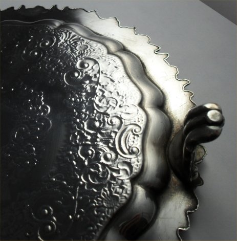 I have just bought this and I am puzzled because the design goes right through to the back like some modern silver. I am pretty sure it is antique, it also has an armorial which I cannot completely identify, could be Watson or Wentworth they both use the motto mea gloria fides. There are no makers mark but a scratched mark in the centre back which could be an inventory mark?[/img]