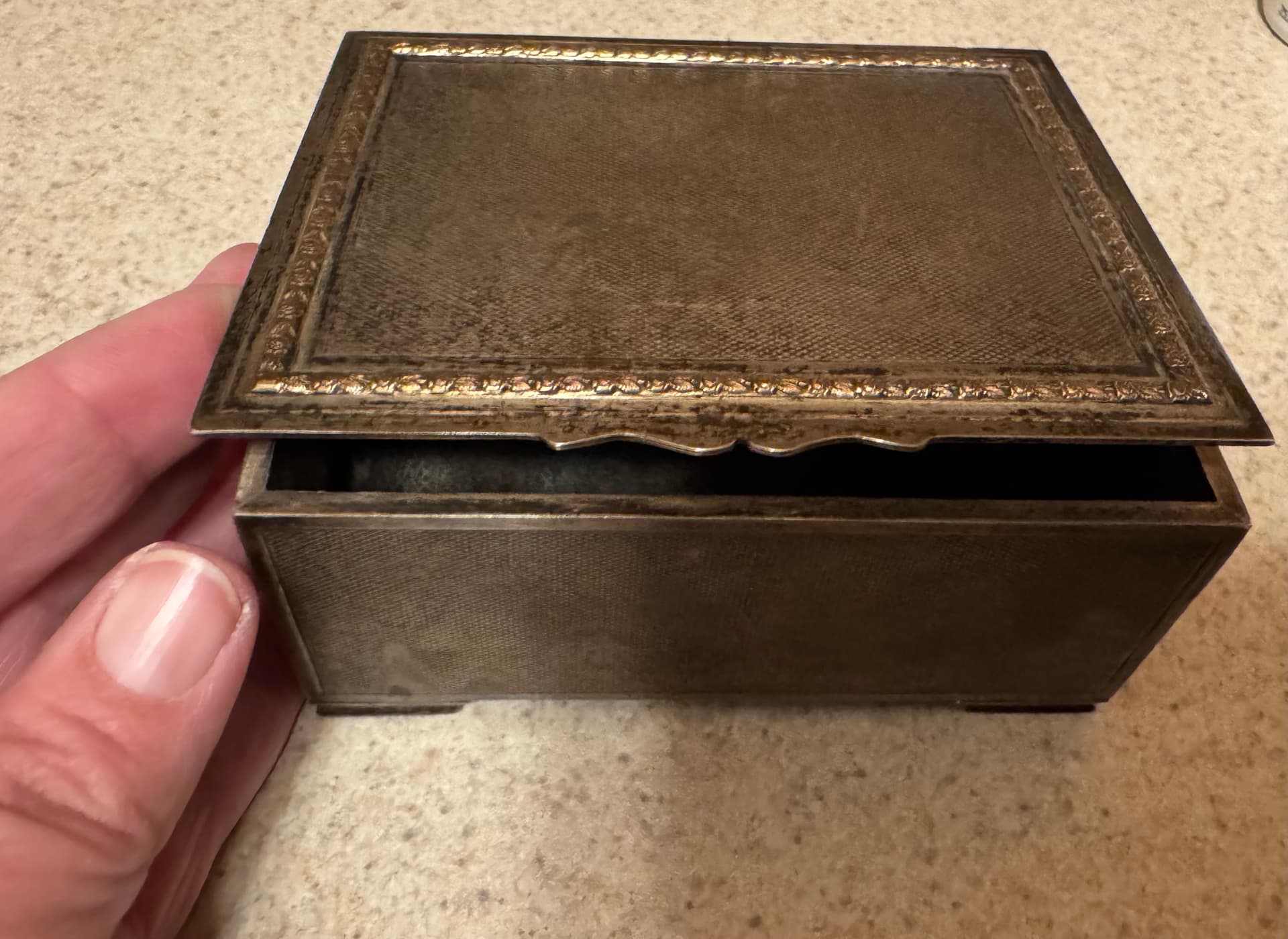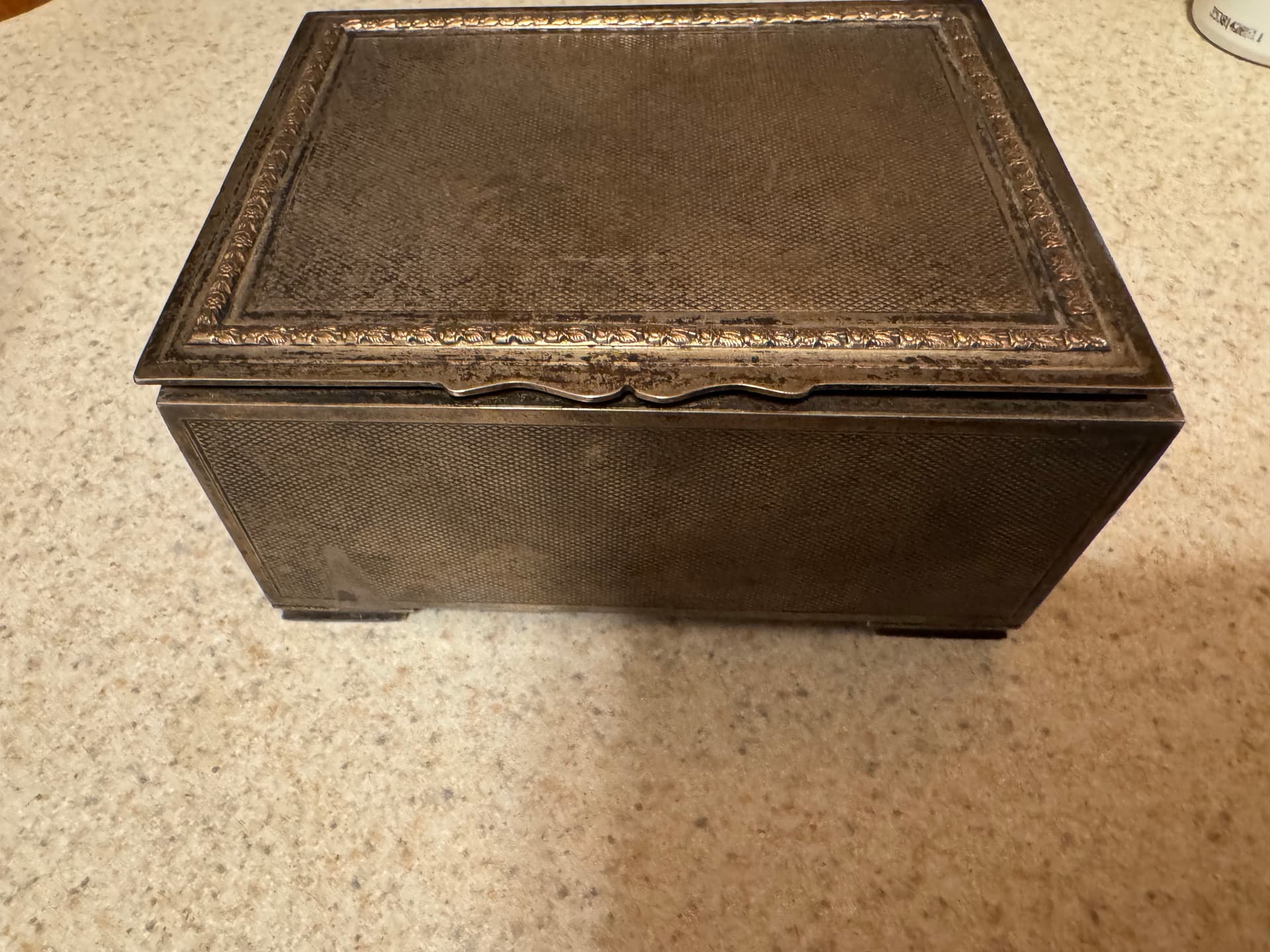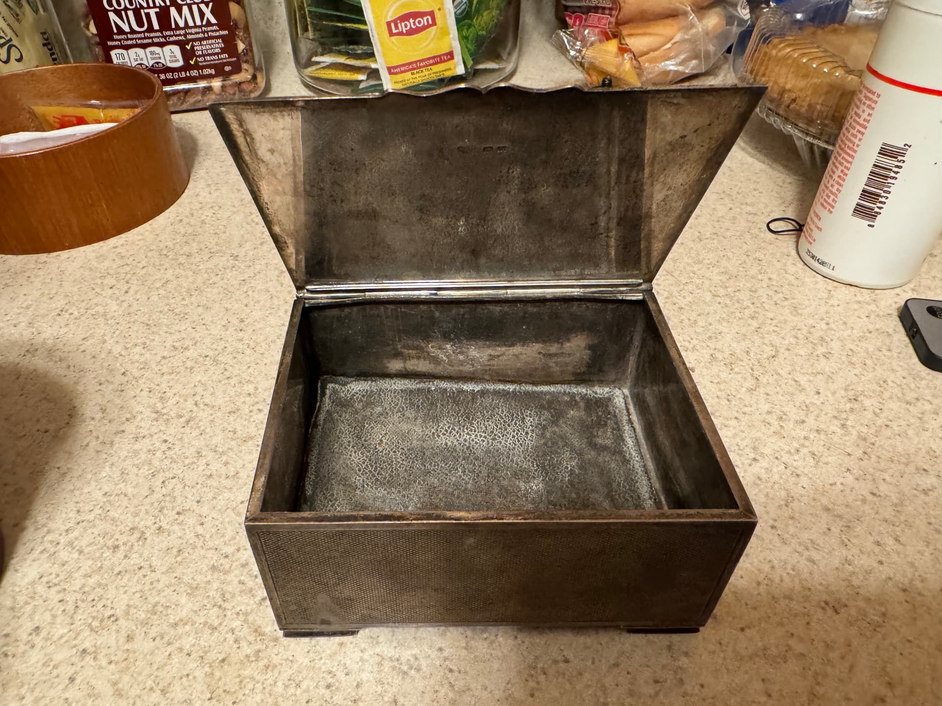 This is their London, UK registered mark and the date of assay is 1927. This cigarette or cheroot box will have had a cedar lining and divide in it when sold.