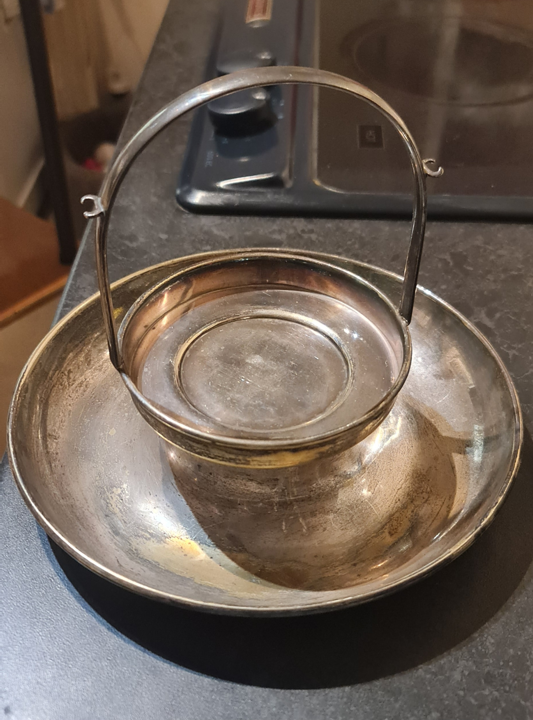 I’ve come across this and wondered if anyone can help identify what it might be for. The only marking is EPNS, so it’s silver plated. There’s hooks on either side of the handle, maybe suggesting it was either connected to another item or used to hang cutlery if it was a nut/candy dish? I can’t find anything similar on Google and I’m intruiged.