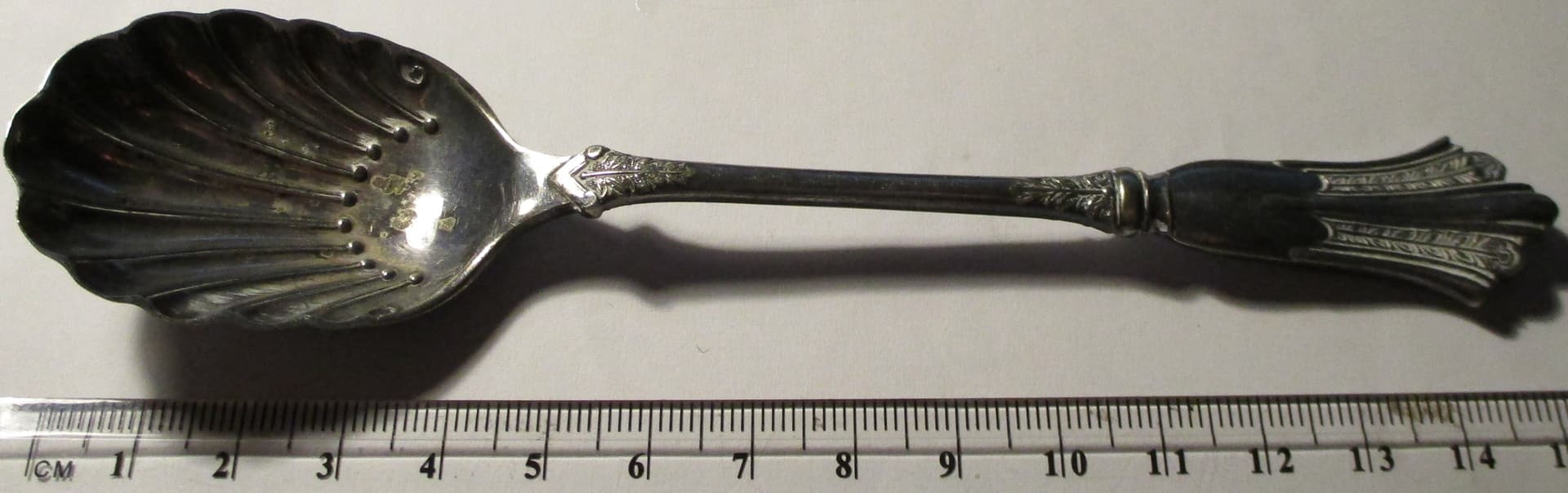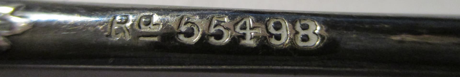 Now I’m hooked on identifying the rest peices in the box. One of the items in the box is what I believe to be a desert spoon. Its has a dark blueish tone, with signs of being polished in the past. I can not date the item or identify the maker. It’s a quality piece. There is also an impressed number Rd. 55498. I will also include photos. Any assistance is appreciated.