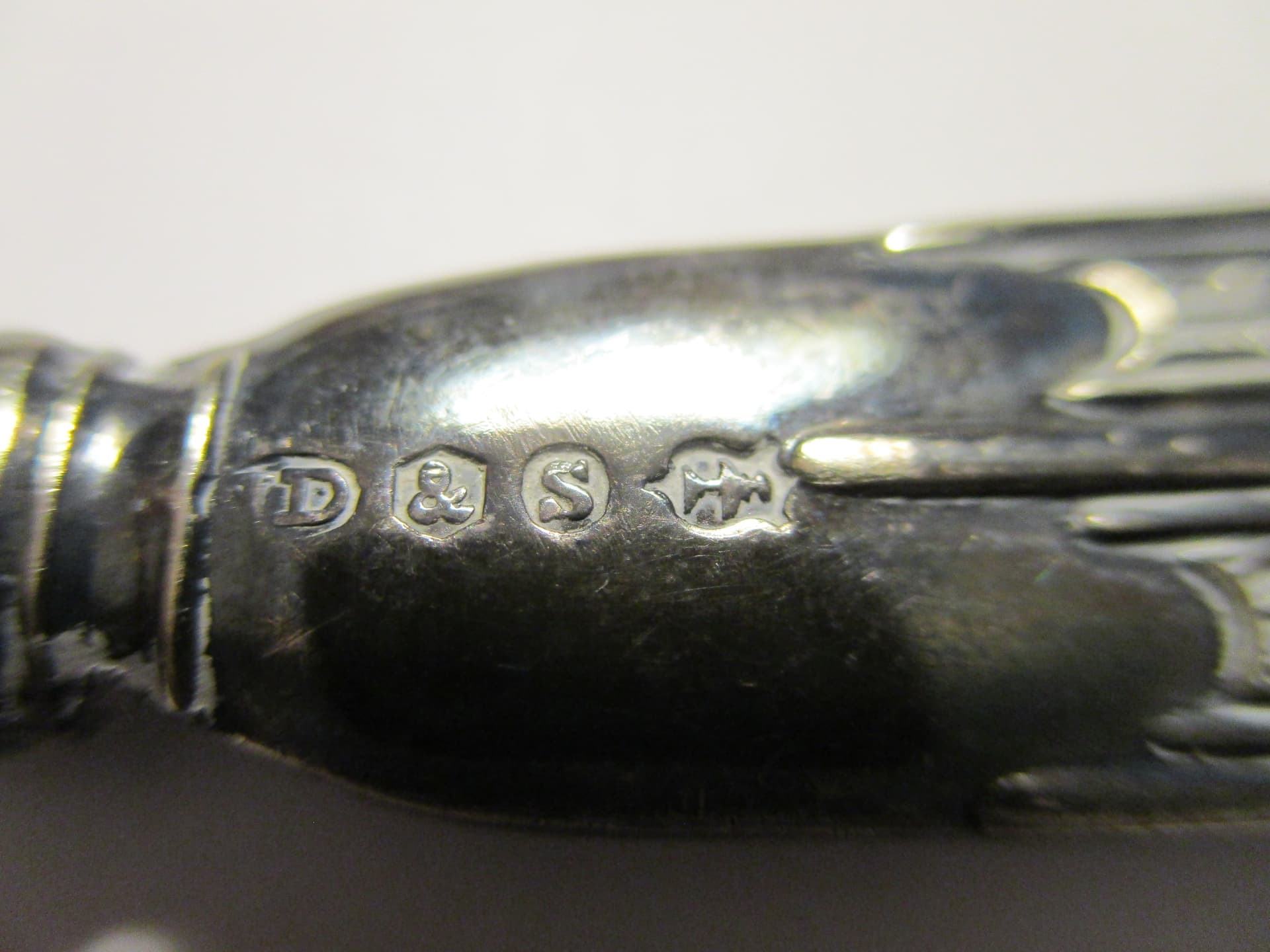While often interpreted as a lamp, the mark is actually a desk bell. The company added it to its hallmarks for silver-plated production to avoid confusion between the two manufacturers. Dixon & Sons used a bugle as its trademark. Unusual to see it on sterling.