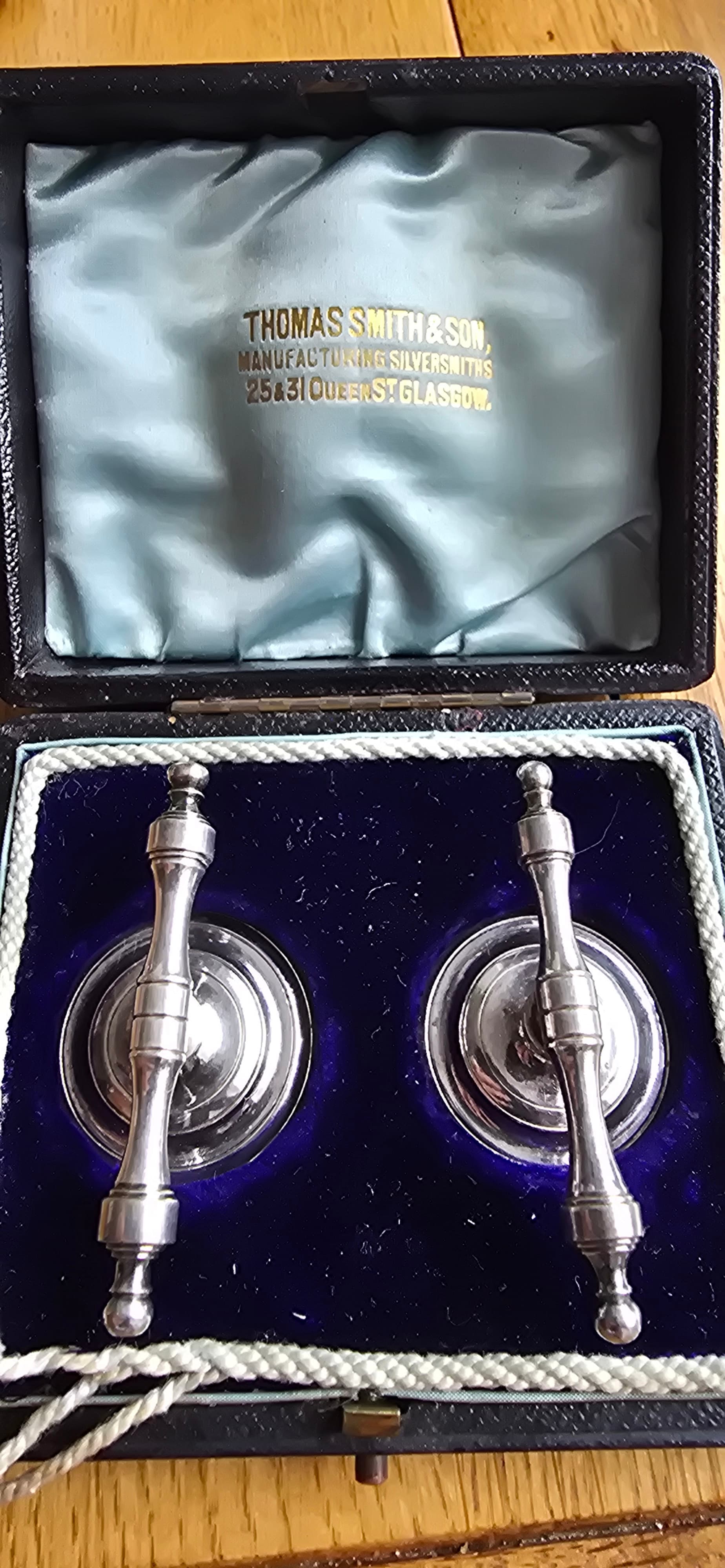 I have a beautiful pair of cutlery stands in original box marked thomas smith and sons. Anyway they are not magnetic so im wondering if solid silver ? Theres the tinyest of marks on the back and im wondering if someone with a little more expertise could tell me what they are please. Infact any info would be greatly recieved.