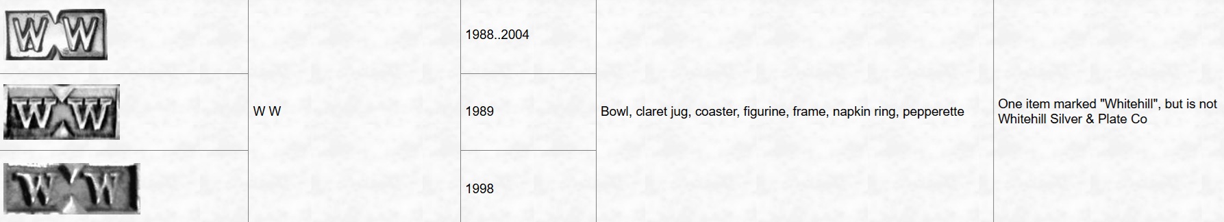 We thought originally that this was the jug used in the film Remains of the Day with Sir Anthony Hopkins. But when I researched the hallmarks, I think it shows a 1998 date stamp? (The film was made in 1993 so it cant be from that). One thing I couldnt find out is who the maker is. Does anyone know who WW could be in London?
