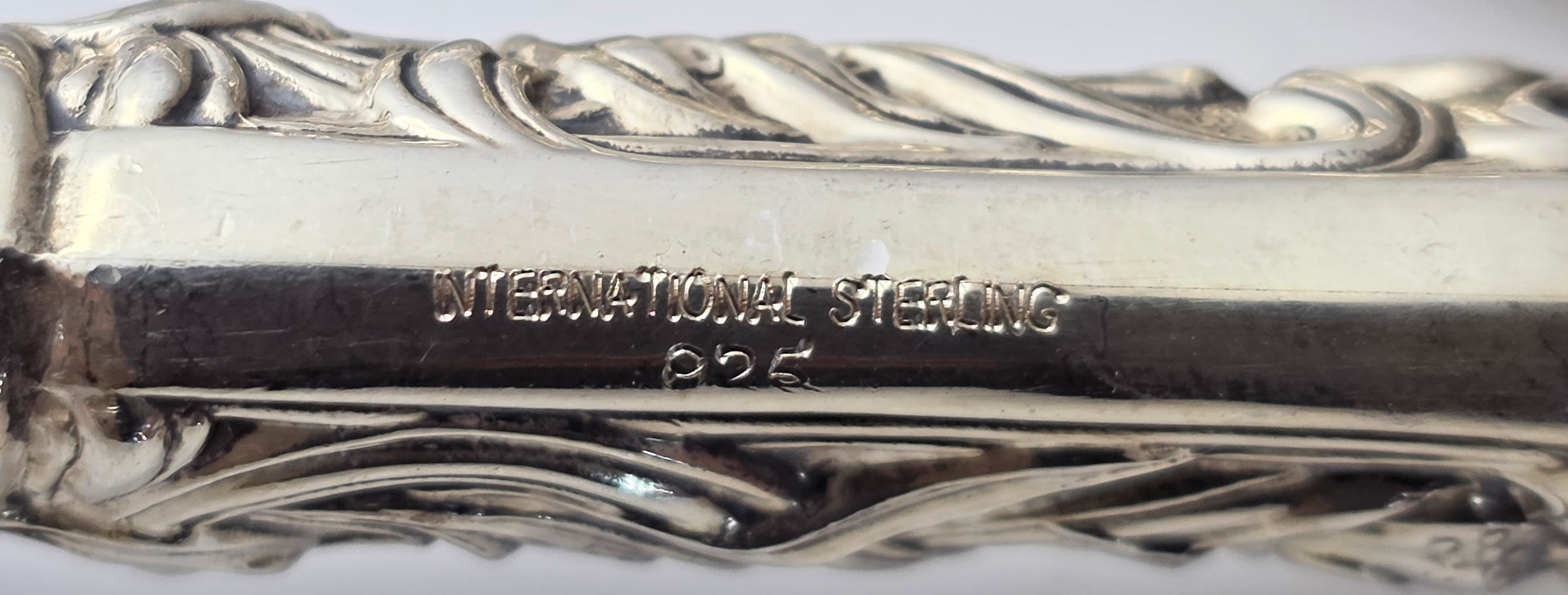 International Sterling introduced the Frontenac sterling silver pattern in 1903. The pattern was originally designed by Simpson, Hall & Miller of Wallingford CT and Montreal one of the smaller companies that was consolidated to form the International Silver Company in 1898.