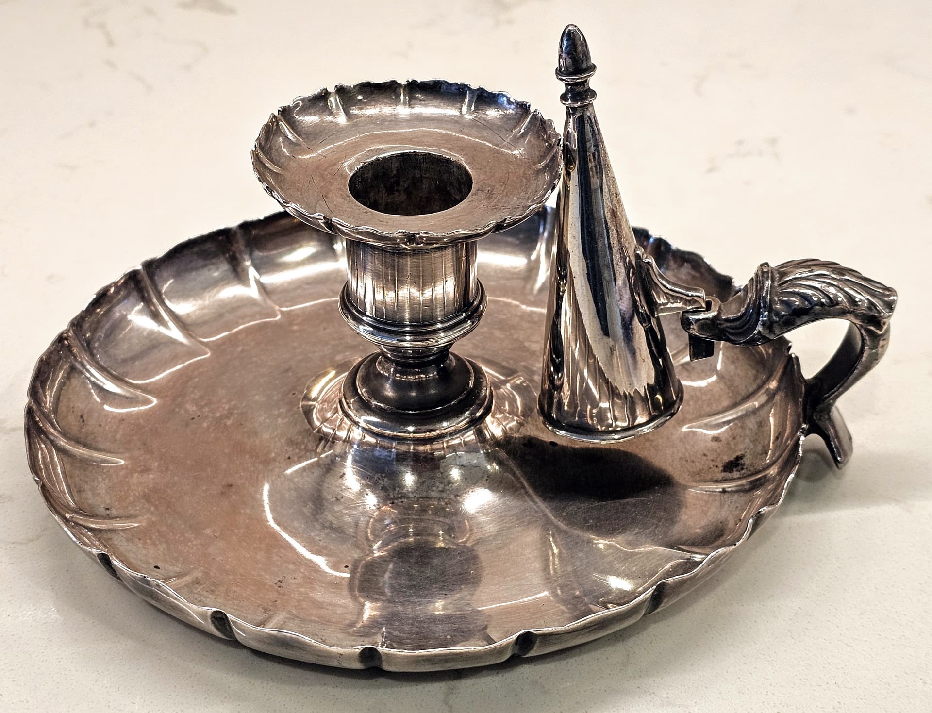If it’s a genuine Georgian chamberstick, could it actually be Close Plate… which I know they used for knives, buckles and candle wick scissors? The metal is less than 1mm thick and has the rigidity of steel and there does appear to be seams on the metal edges.