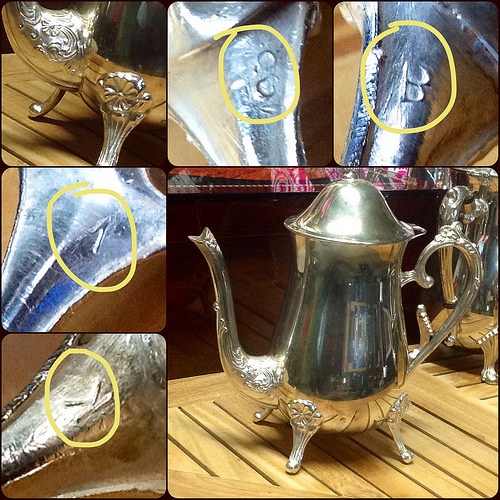 This particular tea pot, I have 2 of these pots and their matching cream and sugar pots. The marks are located on the inside of each leg. These markers have yet to come up in my research. I appreciate any help with this guy and any tips someone may have.