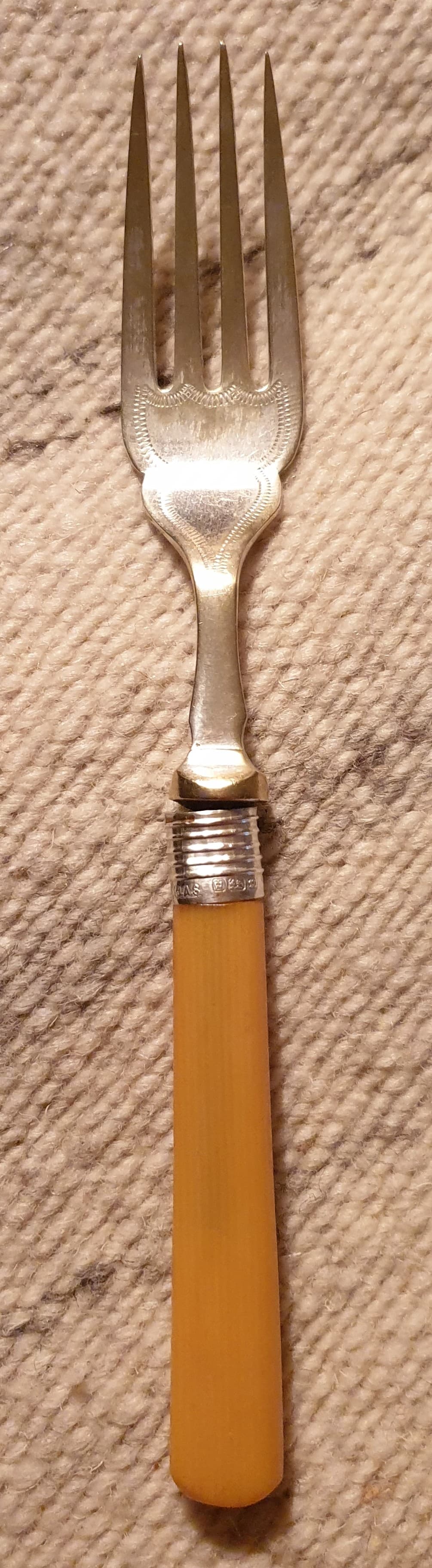 Your relative used the fork enough to render the celluloid somewhat darker than it would have been when it was new.