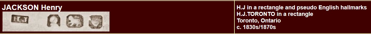 “Ontario produced little handmade silver before the transition to manufactured wares. The first local work may have been by the Loyalist Jordan Post, who settled in York [Toronto] in 1787. Early 19th-century flatware bears the marks of makers in Niagara, Kingston and Toronto. Known hollowware is scarce, although large presentation cups were made by William Stennett (1829) and Henry Jackson (1838).”