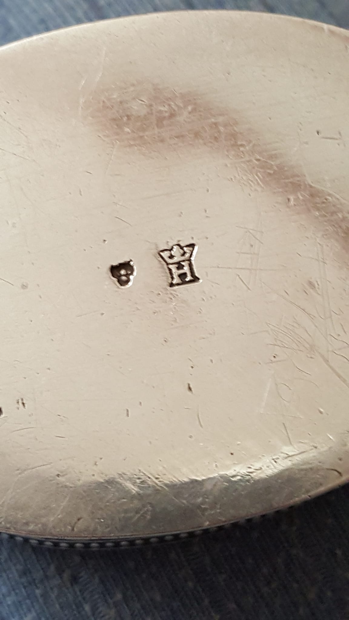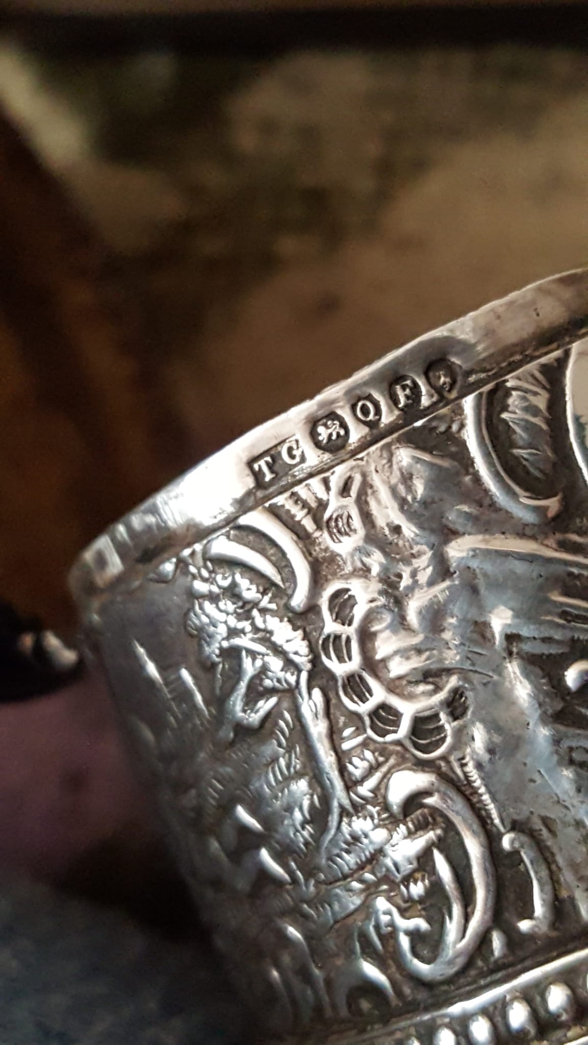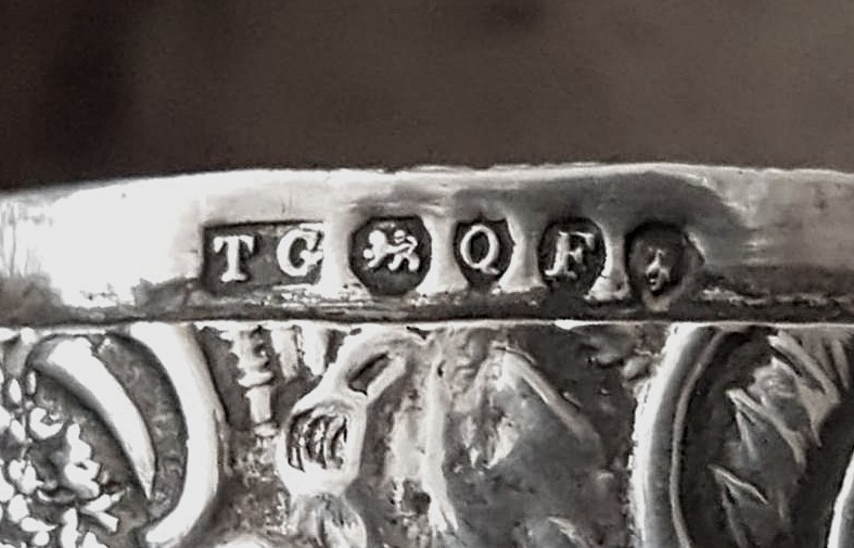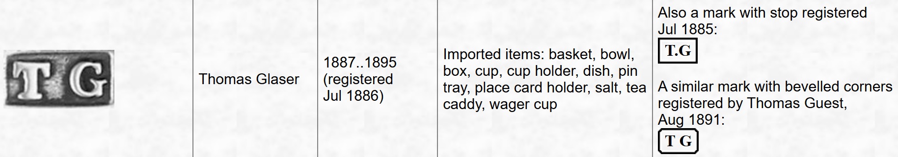 T G is the sponsor mark of the London importer, Thomas Glaser. His mark was registered in Jul 1886 at the London Assay Office. F = “Foreign” mark used by all assay offices 1867-1904. Date letter Q - 1891.