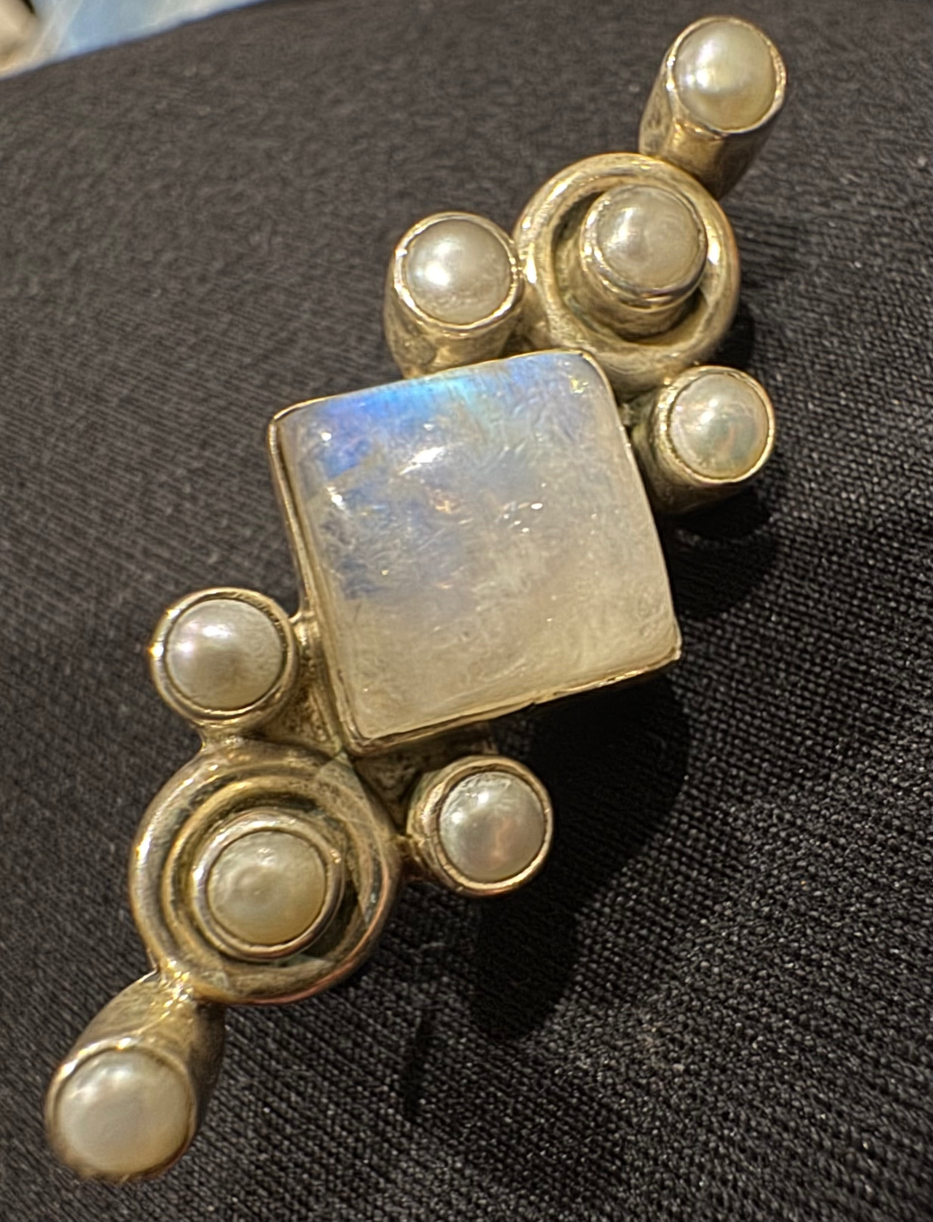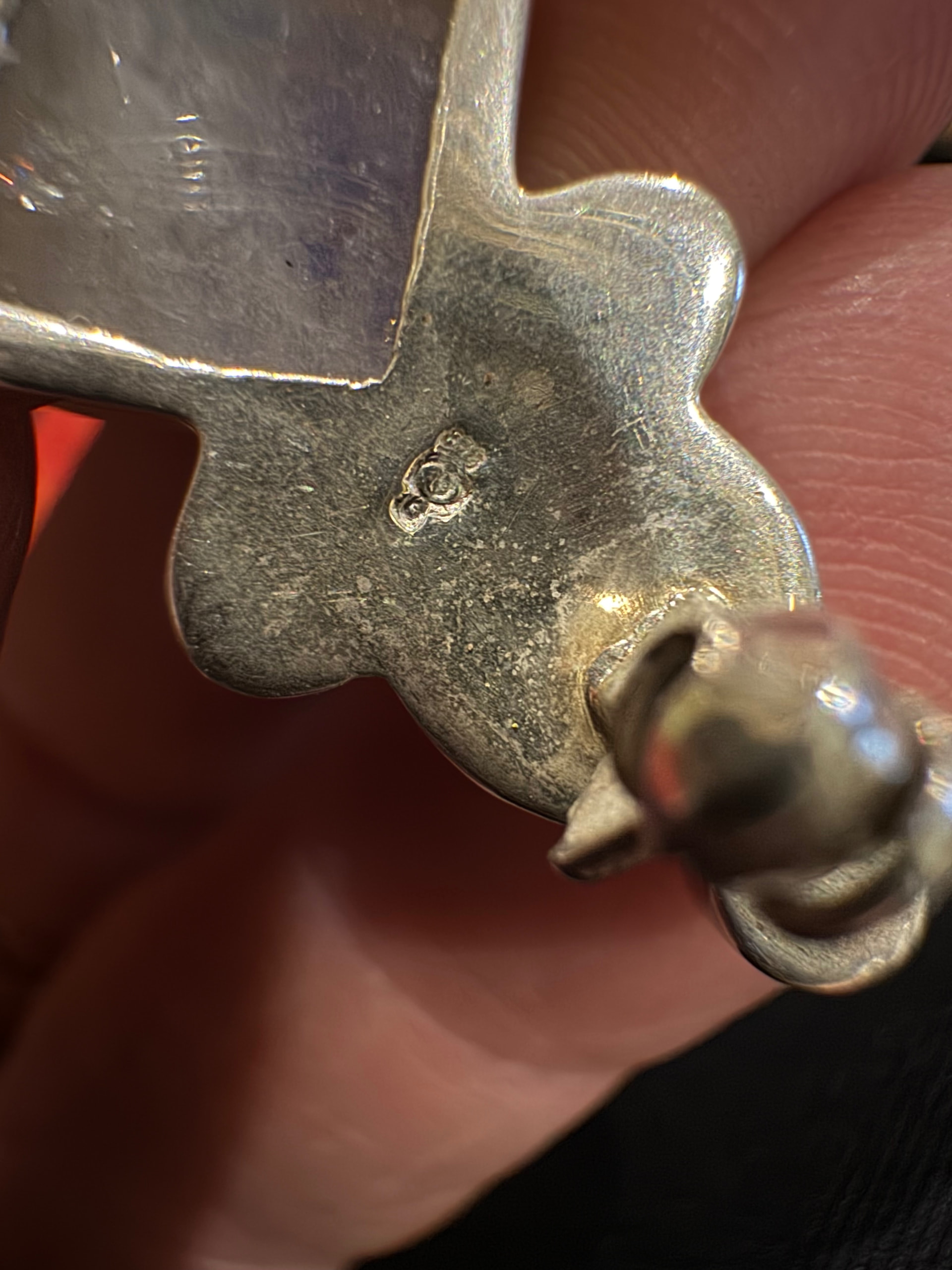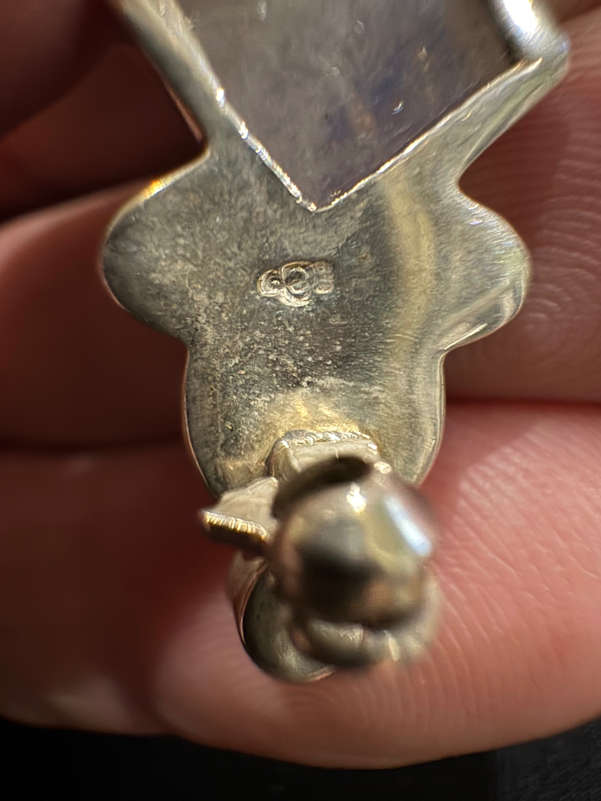 My little brooch here is just over an inch long. I think it may be turn of the Century? It has a moonstone and small pearls in a Silver setting. The hallmark is obscure and hard to decipher. At the top is a tiny 925 then below that is either a Circle or a heart shape above a smaller circular shape at the bottom. Would this be familiar to anybody here?