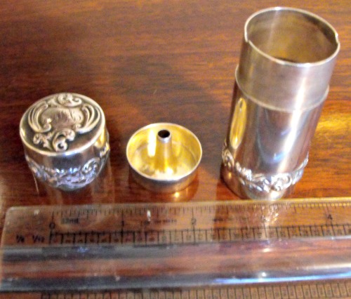 The piece comes in three fitted parts that make up the piece. The small gold chased piece, looks like a “bunt pan” and fits snugly into the top of the 2 1/2" cylinder. The ornate engraved cap fits over the top of the cylinder.