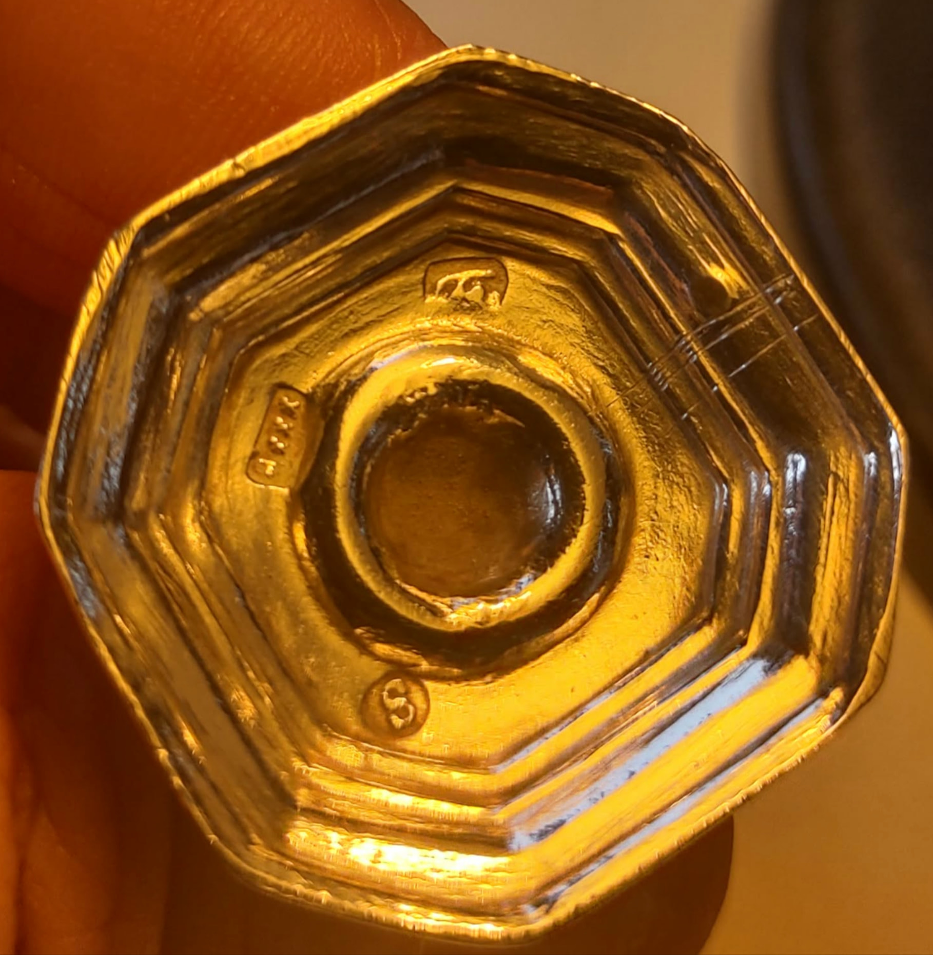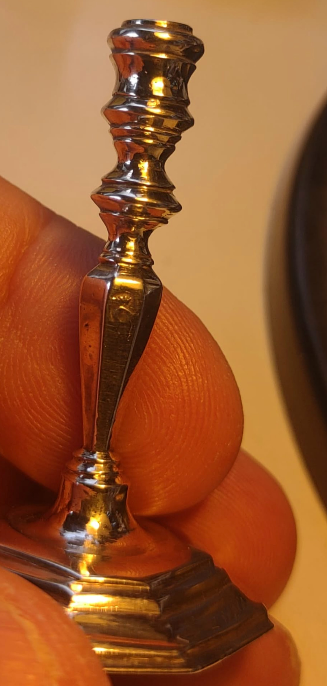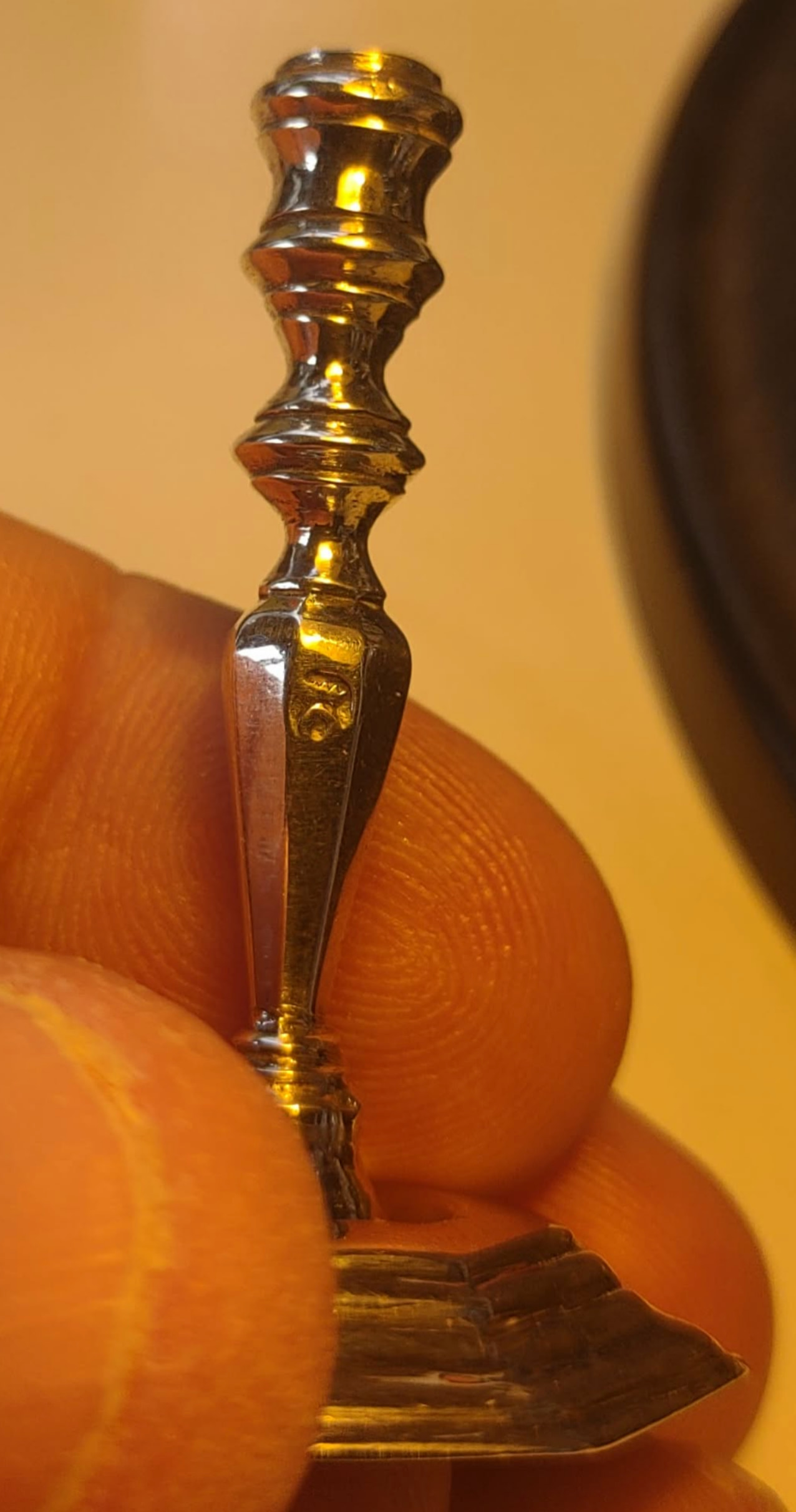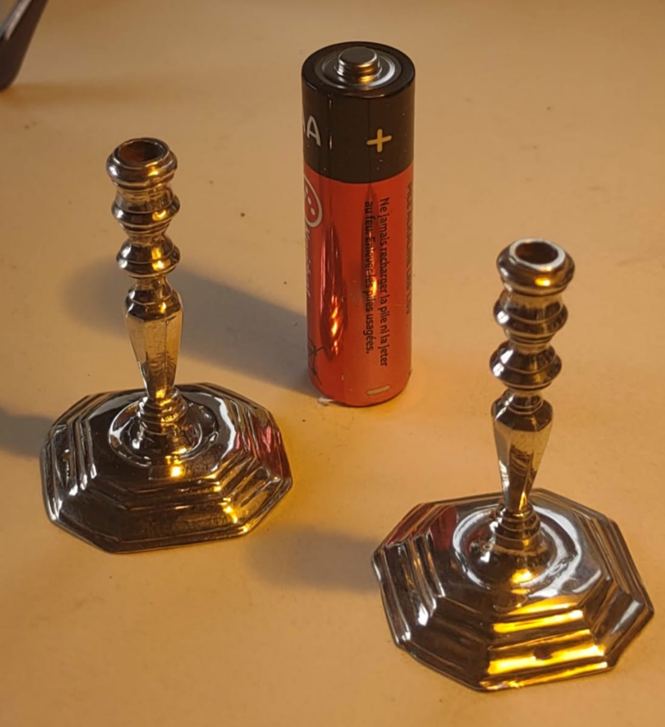 For this fourth set of candlesticks, feel free to take a trip down memory lane to your own childhood. These are miniatures measuring just over 4 cm and weighing only 14 grams each. Rumour has it that they come from the Netherlands and were bought by wealthy children who used to play with them in their doll’s houses? I bought these two together for just €1. When I received the parcel at home, I thought it must be a mistake because it arrived in a small envelope. I’m particularly curious about their age, region of origin, silversmith and, if possible, an indication of their value. At the moment, they adorn a small urn belonging to my recently deceased father-in-law, so I’m not selling them at present. Thanks in advance. This could be a bit of a challenge…