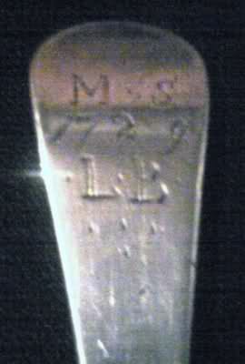Now for my second spoon, also a silver rat tail. On the top back of handle, it has “M S” then right under it, says “1729” then underneath that, “LB”. On the back lower stem is 4 stamps. They all kind of seem to be facing different directions. The first of the 4, starting with the lowest one, is W.T. The 2nd one is a lion with one paw raised. The 3rd is a capital N. the 4th one is a lions head with a crown on top. That one is upside down. Here are the pictures:
